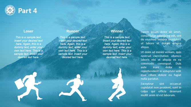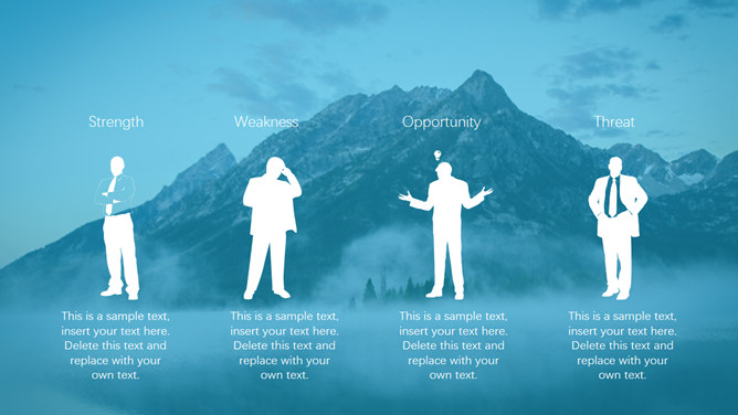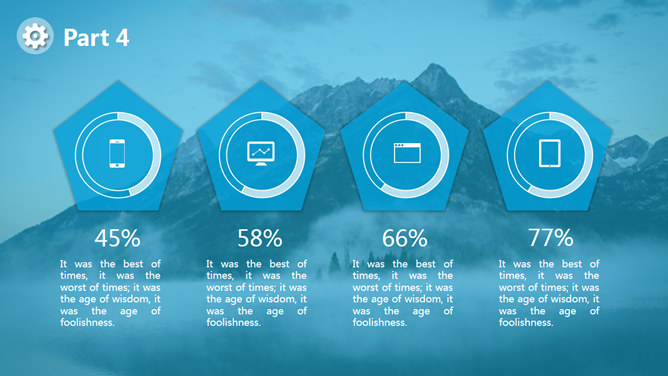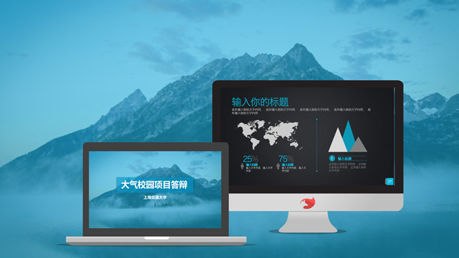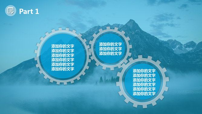 山峰蓝色蒙版图层效果PPT模板。一套多用途通用幻灯片模板,大气宏伟山峰背景,蓝色蒙版图层效果。