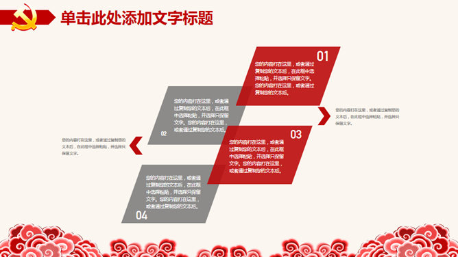 热烈庆祝共产党建党节PPT模板。一套建党节主题幻灯片模板,党徽、华表、国旗、天安门等元素装饰。