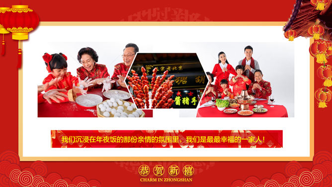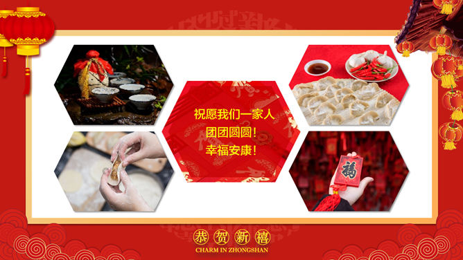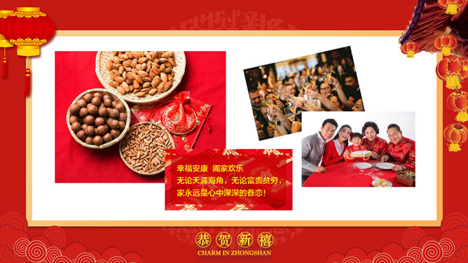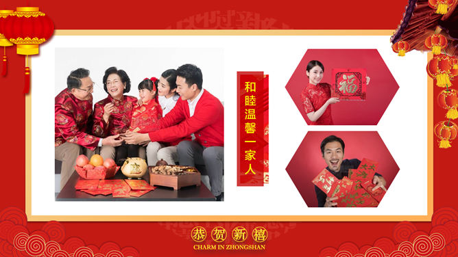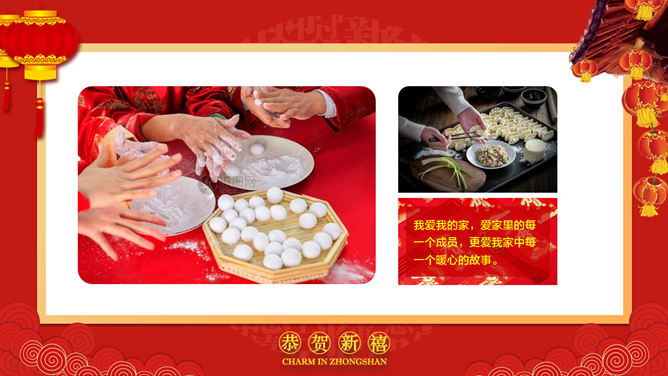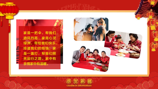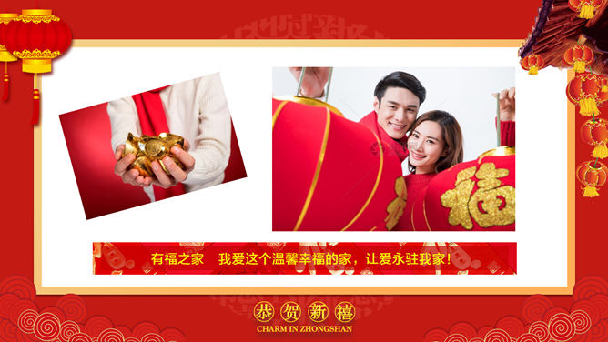 这是一个春节新年幻灯片模板,以带有福字的中国结和象征富贵的牡丹为主元素,以红色为主色调,烘托出了喜庆的节日气氛,适用于表达新春祝福、恭贺新禧的场合。