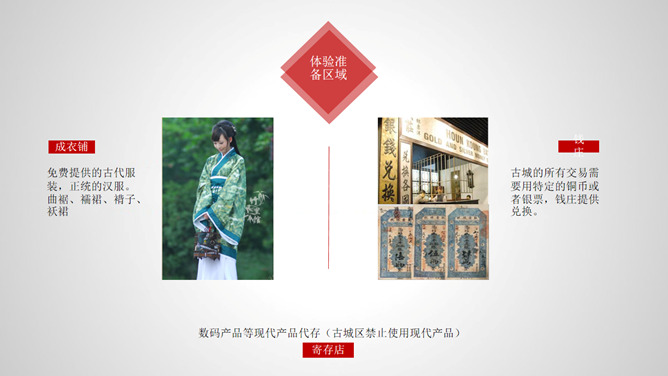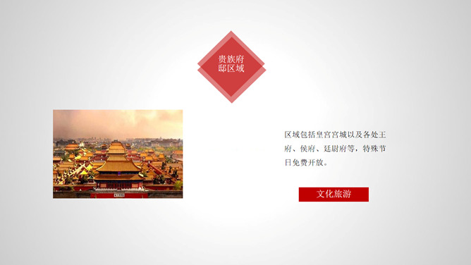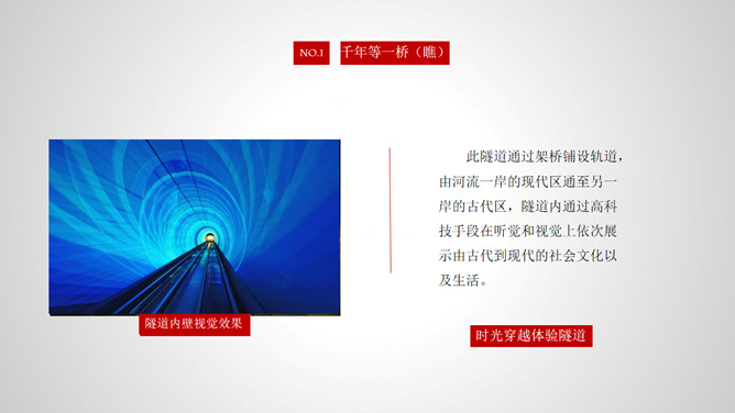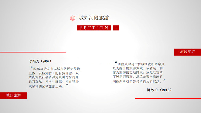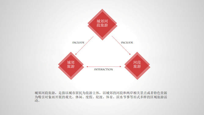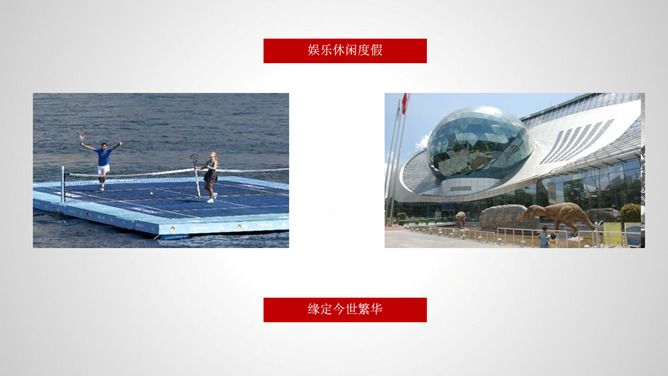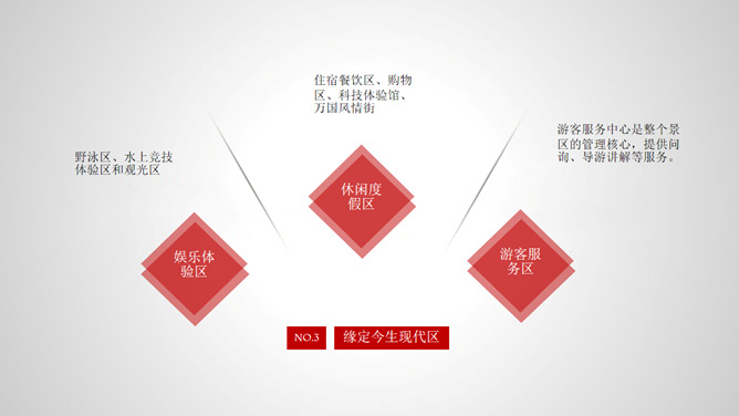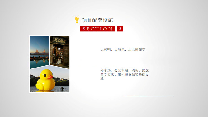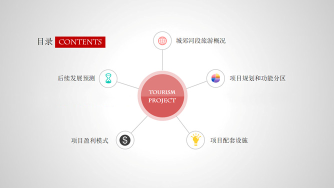 旅游项目策划方案PPT模板。一套大方实用旅游项目策划幻灯片模板,渐变灰色背景,红色主色调,包括旅游概况、规划和功能分区、配套设施、盈利模式和后续发展预测。