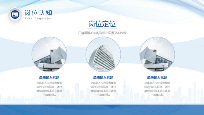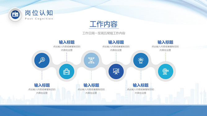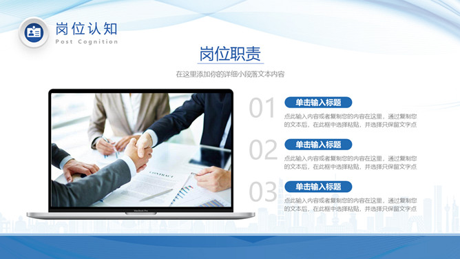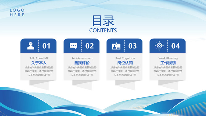 新员工入职自我介绍PPT模板。包括关于本人、自我评价、岗位认知、工作规划等部分,简约大气,波纹装饰。