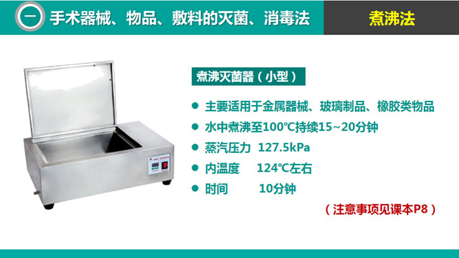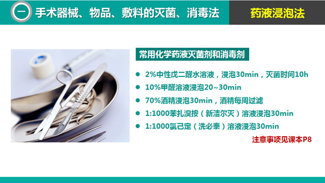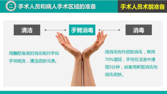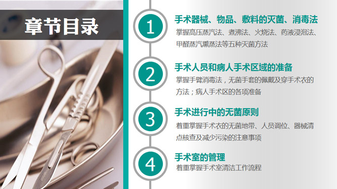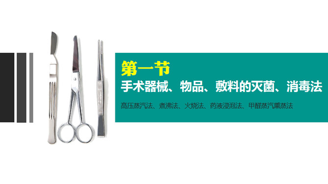 无菌操作无菌术PPT课件模板。包括:一、手术器械、物品、敷料的灭菌、消毒法。二、手术人员和病人手术区域的准备。三、手术进行中的无菌原则。四、手术室的管理。