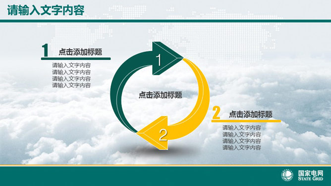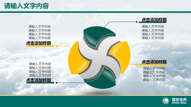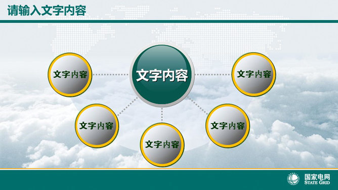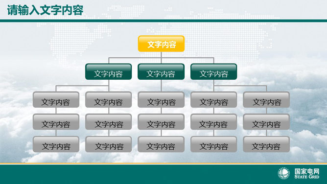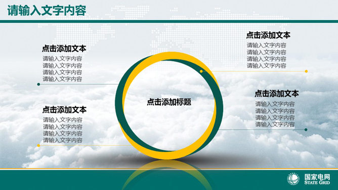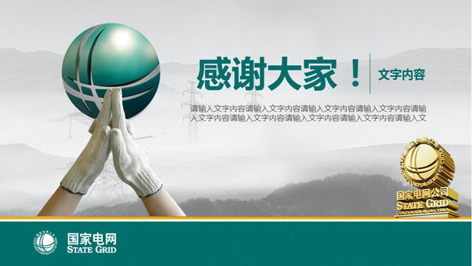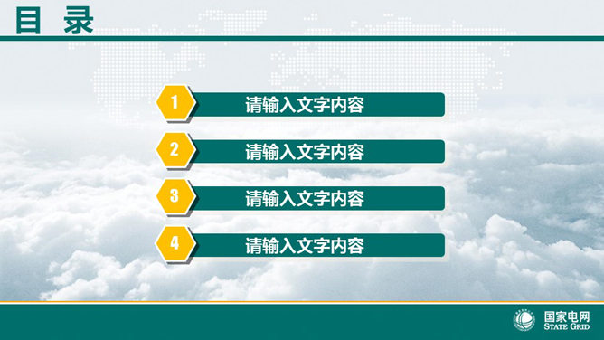 这是一个国家电网官方的PPT模板,背景以国家电网的标志为主元素,适合电力公司的工作汇报总结相关的主题演示。