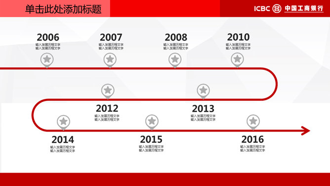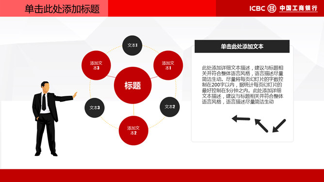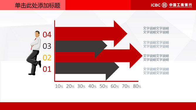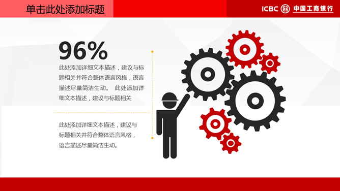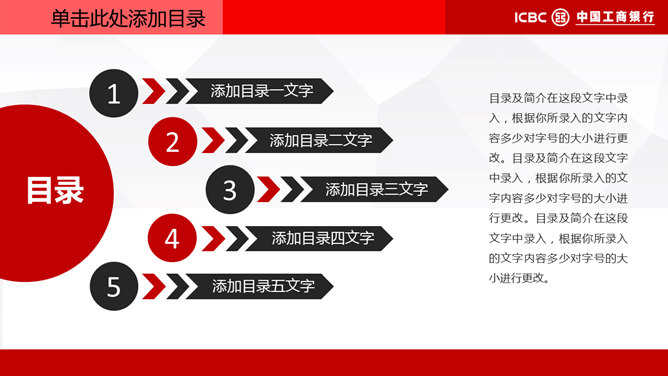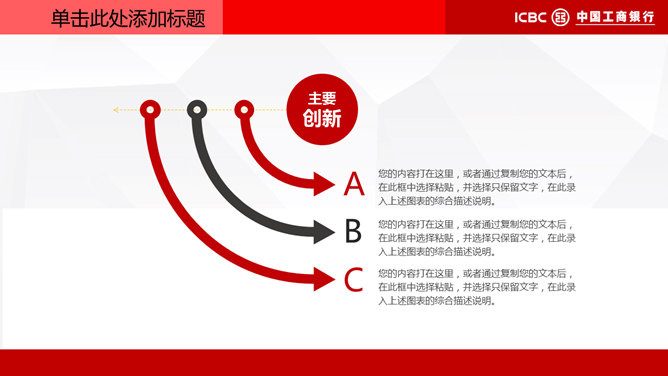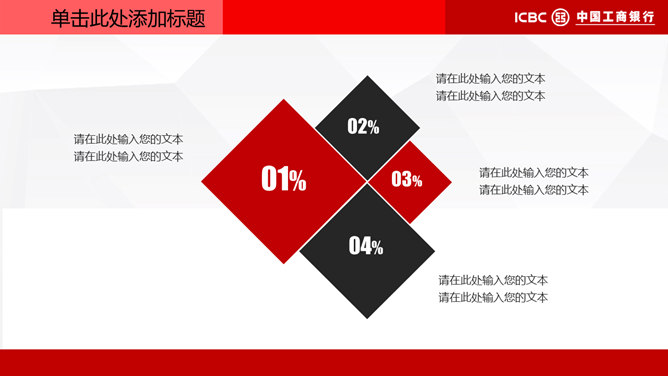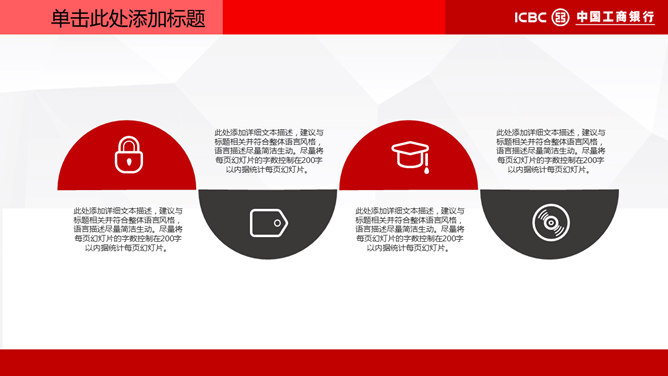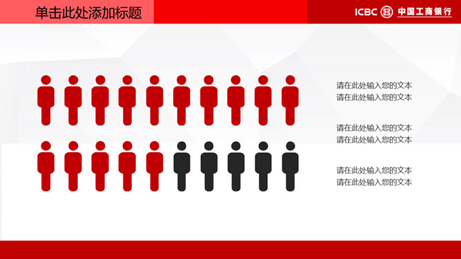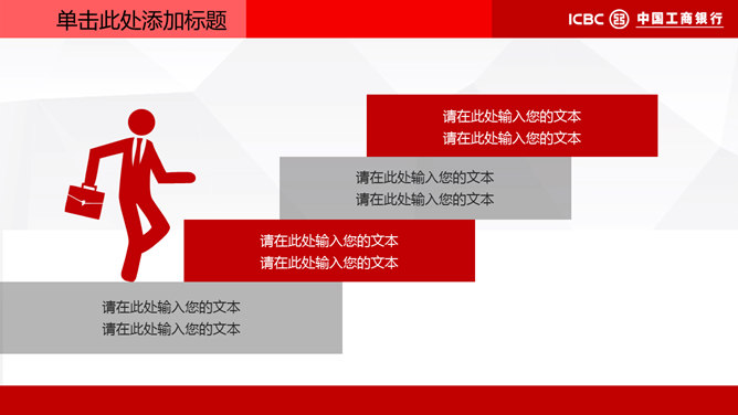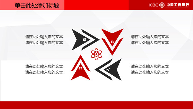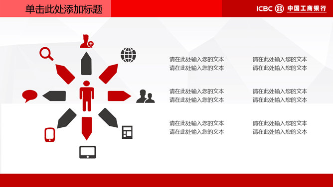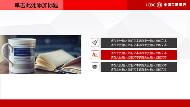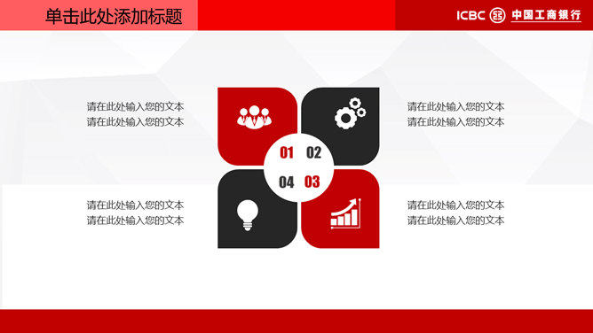 中国工商银行专用PPT模板。一套中国工商银行汇报报告专用幻灯片模板,采用工商银行logo和红色主题色设计。