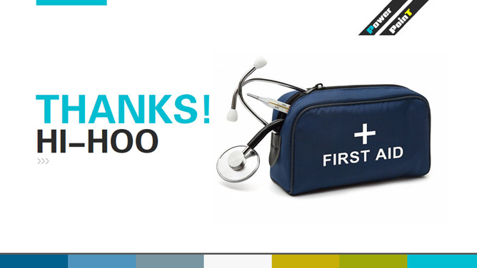 医疗急救培训课件PPT模板。一套医疗健康主题幻灯片模板,以装有听诊器等医疗设备的急救包为背景,适合急救课件。