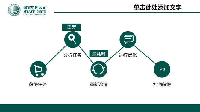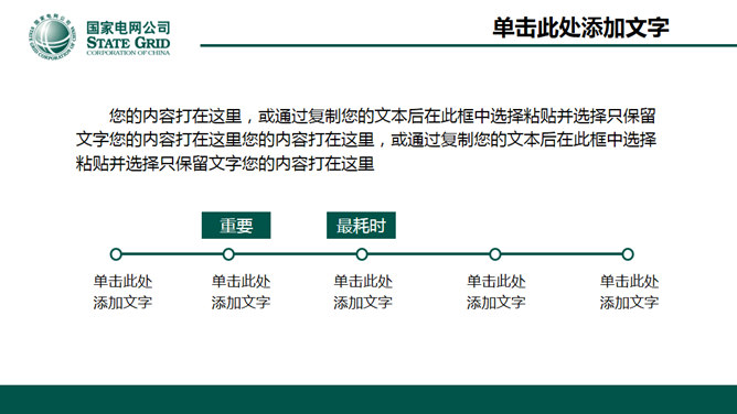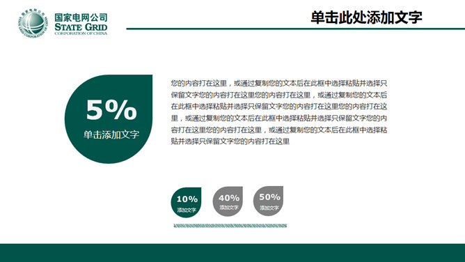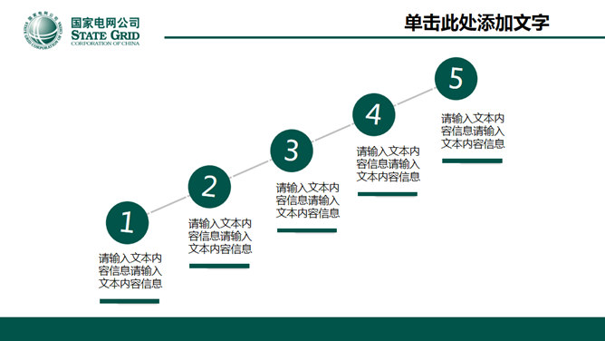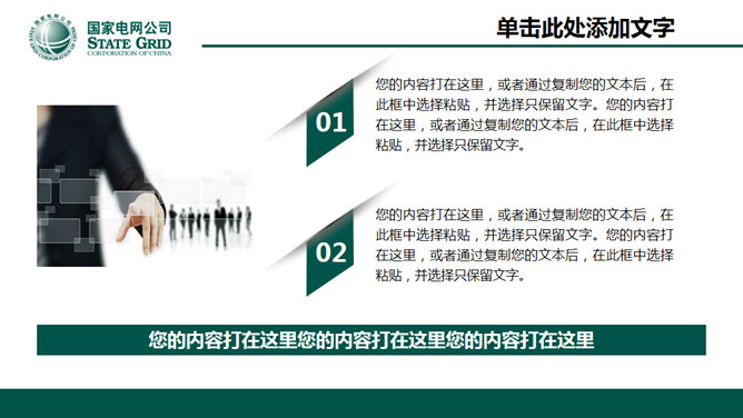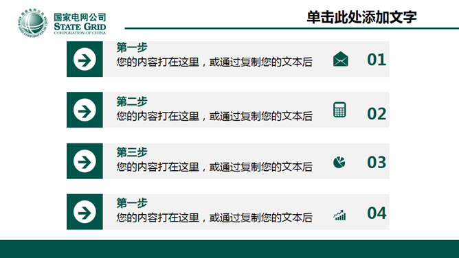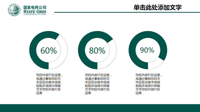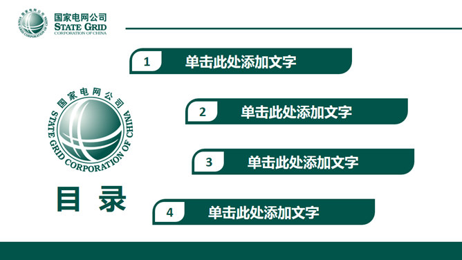 国家电网电力公司官方幻灯片模板。此模板采用国家电网的LOGO标志设计,适合国家电网公司的业务宣传、客户服务、工作汇报总结等用途。