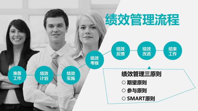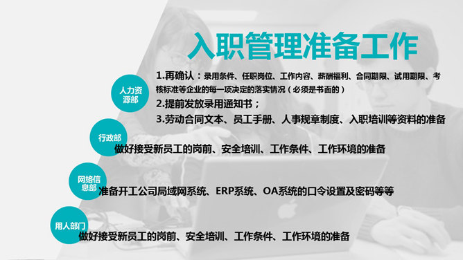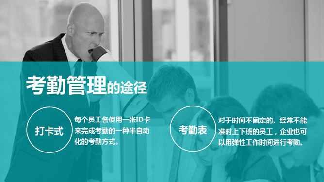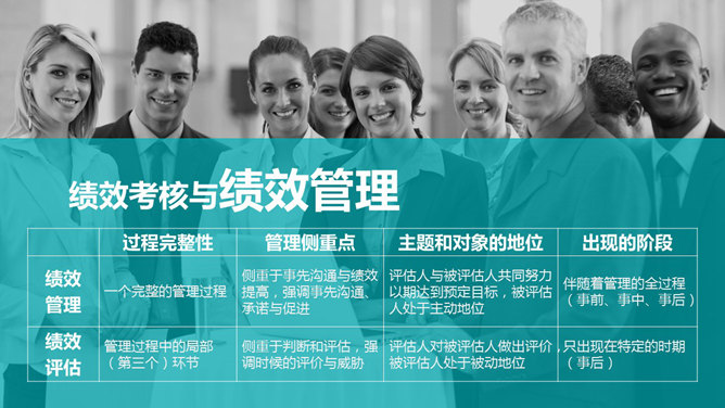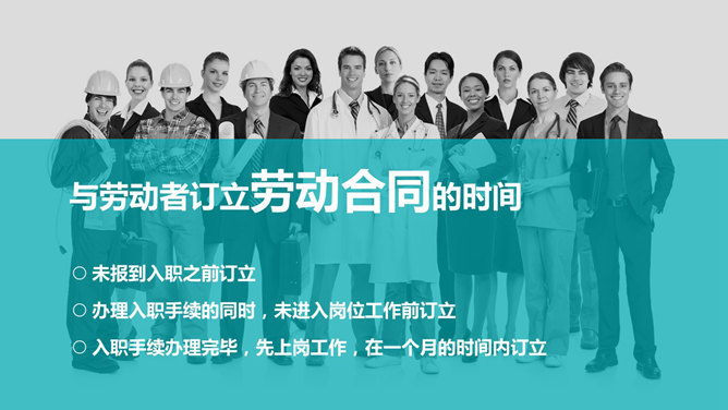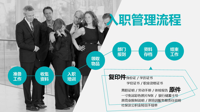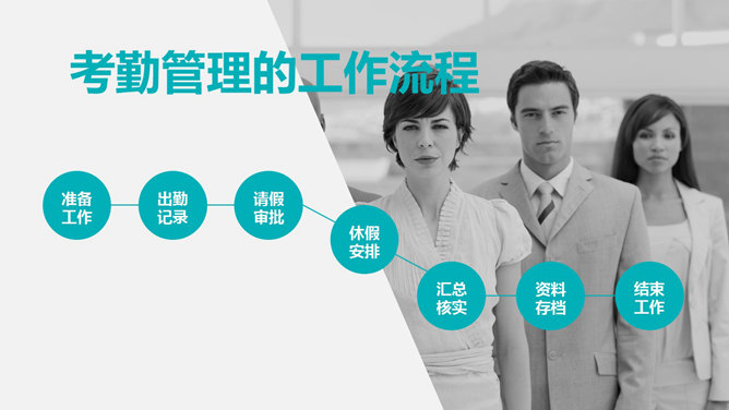 公司HR人力资源管理PPT模板,以站成两排身着西装的职场人士为背景,包括招聘工作、入职管理、考勤管理、绩效管理、离职管理几部分。适用于HR部门、人事管理的方法流程、猎头公司等相关的演示。