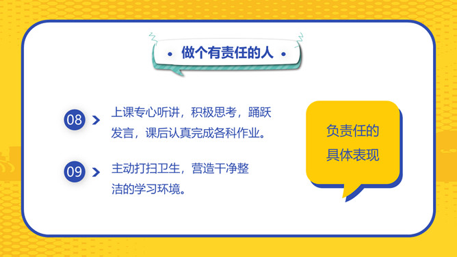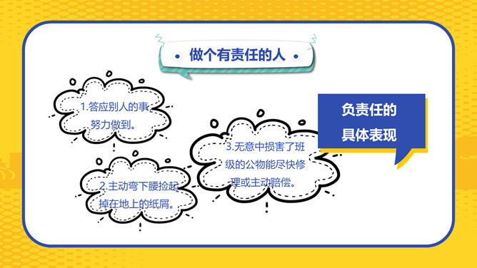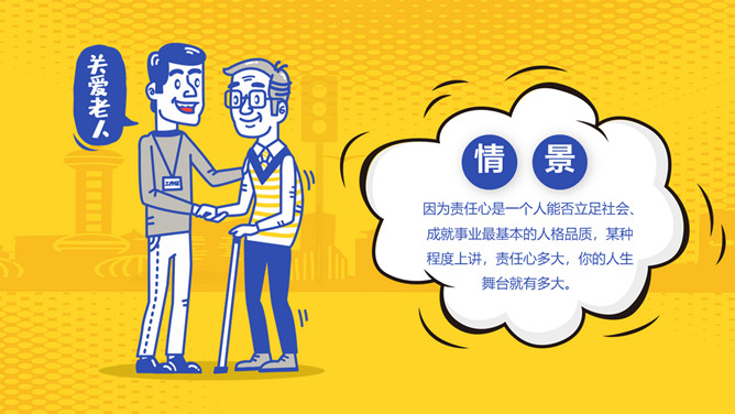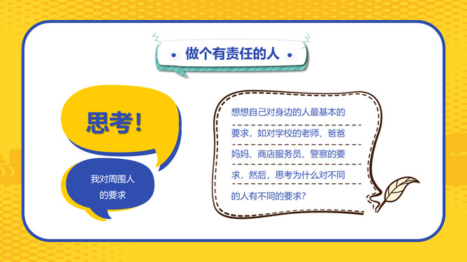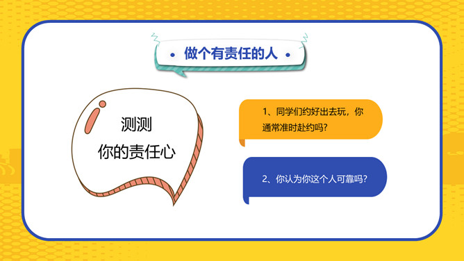 文明社会做个有责任的人班会PPT模板。责任心是一个人能否立足社会、成就事业最基本的人格品质,某种程度上讲,责任心多大,你的人生舞台就有多大。