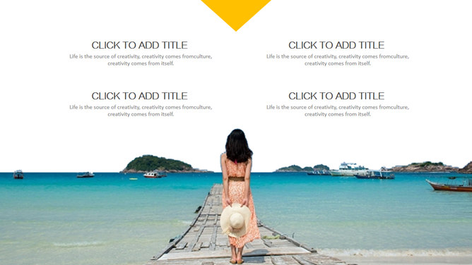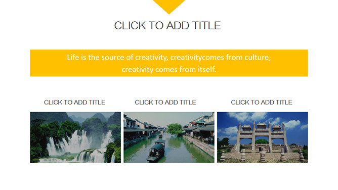 旅游项目景点宣传介绍PPT模板。一套精美的旅游行业幻灯片模板,时尚全图型排版布局,适合景点风景展示介绍。建议安装字体: