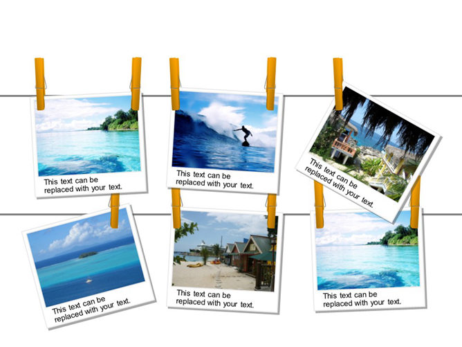 旅行旅游照片展示幻灯片模板。此模板以夹子夹着照片挂在晾衣绳上为设计效果,风格唯美清新。适合旅游相册制作或景点介绍等。