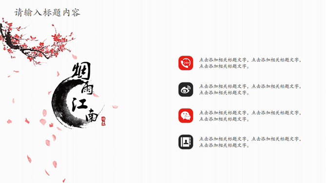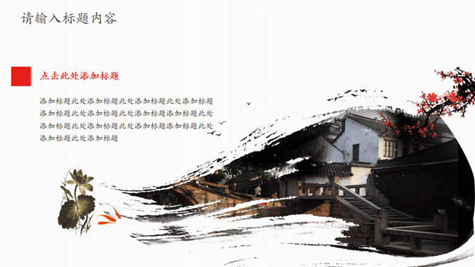 江南水乡古镇PPT模板。此模板采用水墨中国画风格的江南古镇为背景,用红色梅花点缀,风格古典雅致。适合周庄古镇,同里古镇,角直镇,西塘古镇,南浔古镇等著名古镇的介绍。