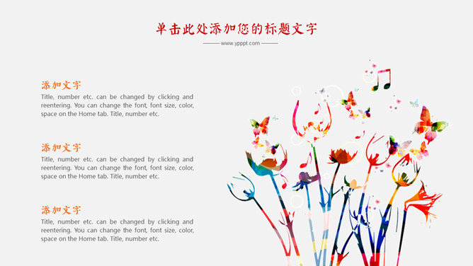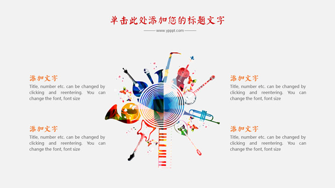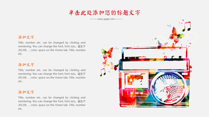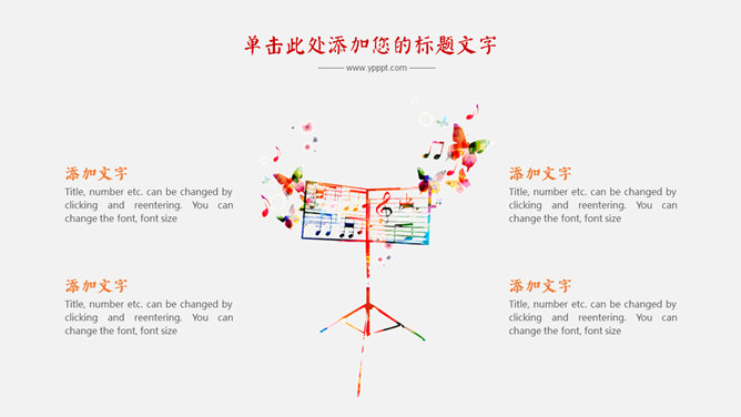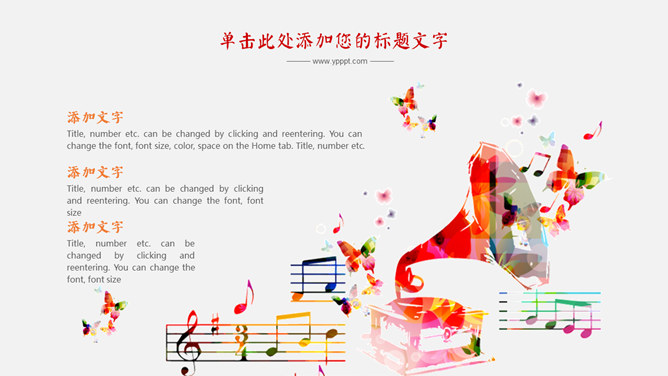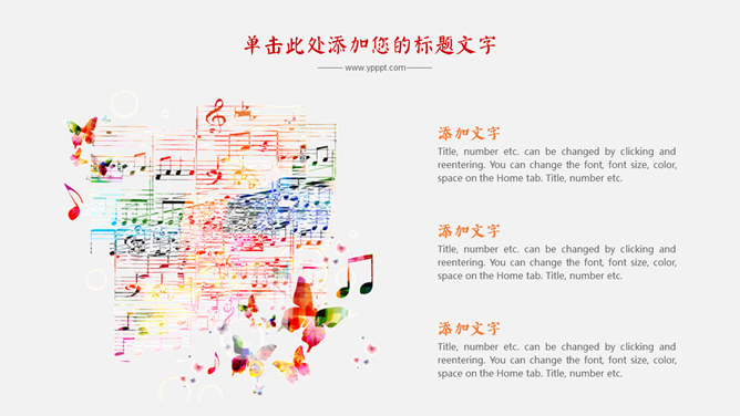 炫彩音乐符号文艺范PPT模板。一套音乐相关幻灯片模板,音乐符号主题设计,绚丽色彩。使用字体: