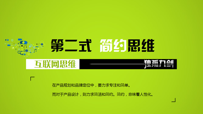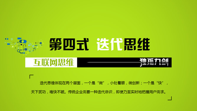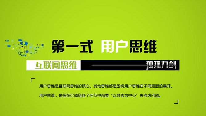 互联网思维独孤九剑PPT读书笔记。第一式 用户思维,第二式 简约思维,第三式 极致思维,第四式 迭代思维,第五式 流量思维,第六式 社会化思维,第七式 大数据思维,第八式 平台思维,第九式 跨界思维。