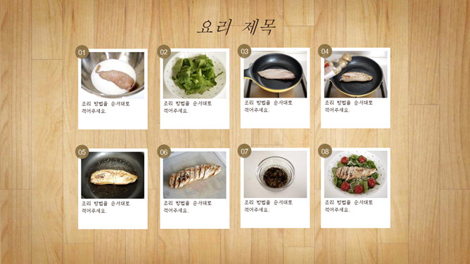 美食图片菜谱展示幻灯片模板。此模板以原木木纹为背景,以各种让人垂涎的美食和水果图片为主元素。图片可以编辑替换成你自己的。适合美食图片展示、菜谱制作、烹饪流程等用途。