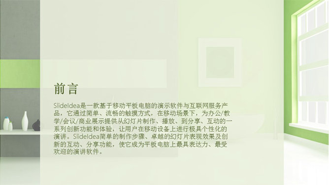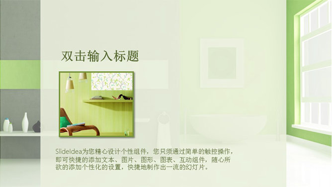 家居室内装修设计幻灯片模板。此模板以简约绿色的室内家居布置为背景,采用16:9比例的宽屏设计,界面简约清新。适合装修公司业务推广、装修效果图演示等用途。