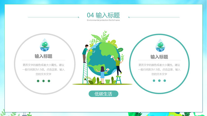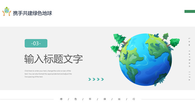 低碳生活节能环保绿色地球PPT模板。一套环保宣传模板,倡导环保节能、低碳生活,携手共建绿色地球。