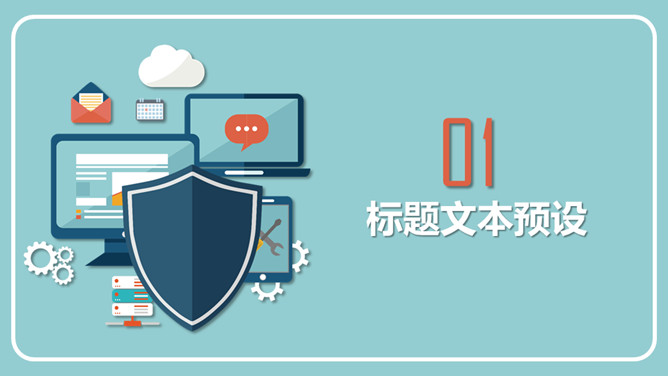网络信息安全防护PPT模板。一套网络安全相关幻灯片模板,以电脑和盾牌为背景,适合网络信息安全防护主题。