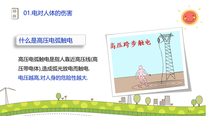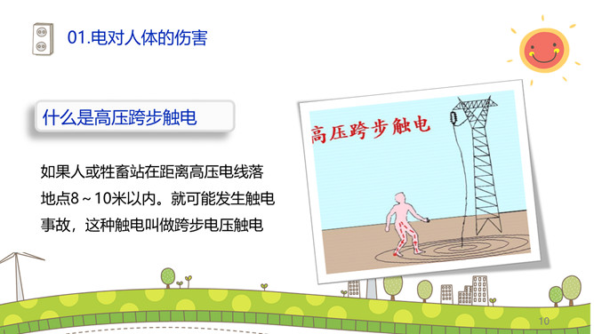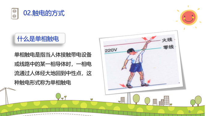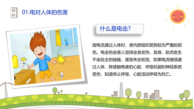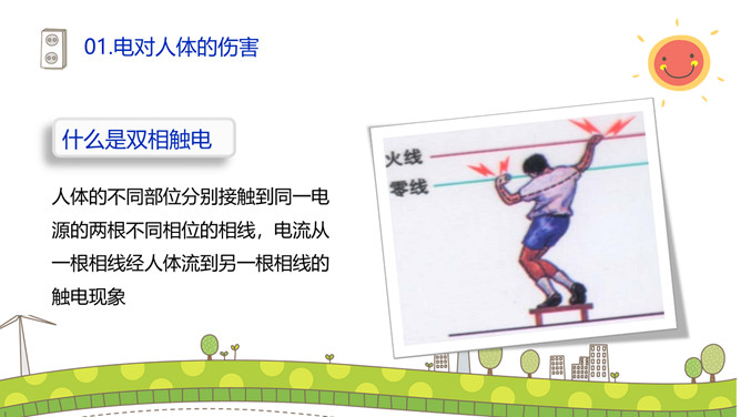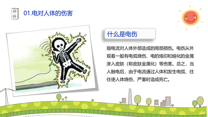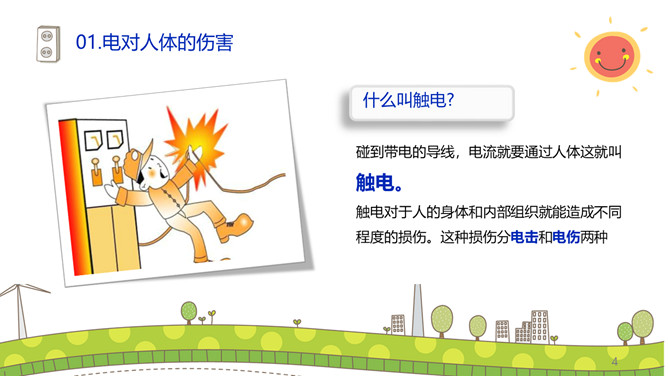 安全用电防止触电PPT模板。碰到带电的导线,电流就要通过人体这就叫触电。触电对于人的身体和内部组织就能造成不同程度的损伤。这种损伤分电击和电伤两种。