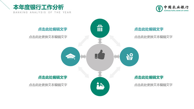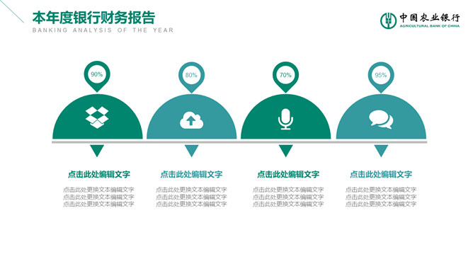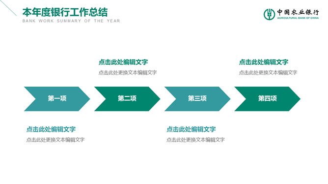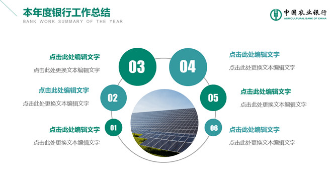 中国农业银行业务产品宣传介绍幻灯片模板。此模板按照农业银行官方风格,、适合农业银行宣传推广金融理财产品使用和员工工作总结汇报。