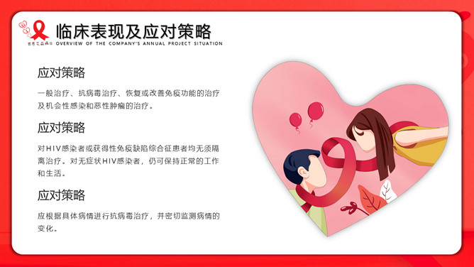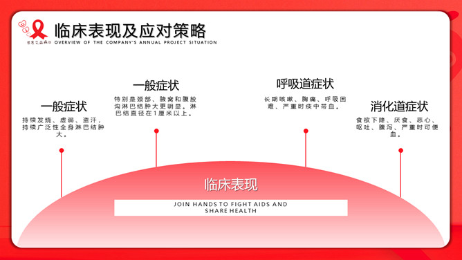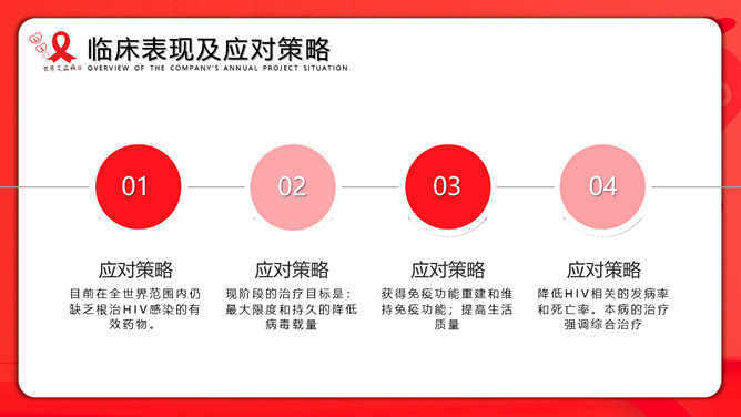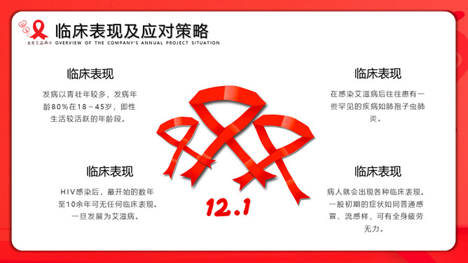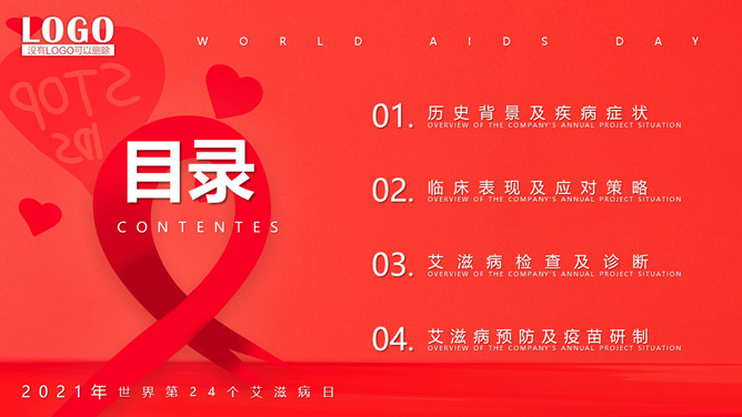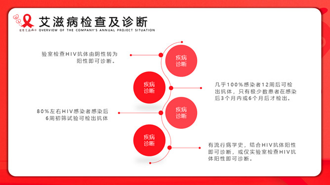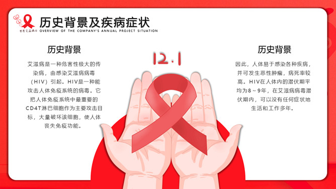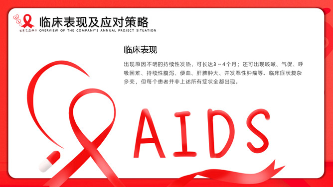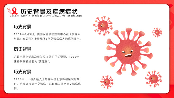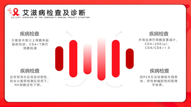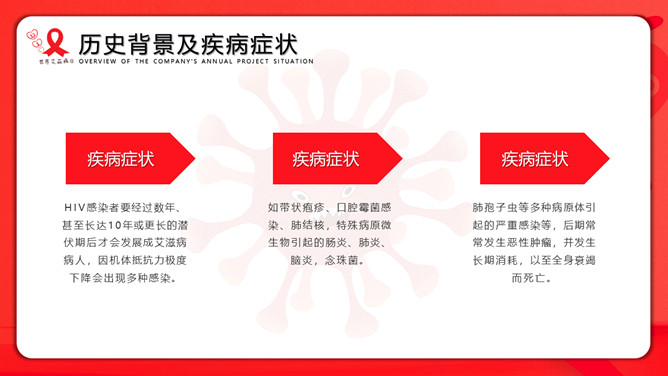 世界艾滋病日宣传活动PPT模板。内容包括历史背景及疾病症状、临床表现及应对策略、艾滋病检查及诊断、艾滋病预防及疫苗研制。