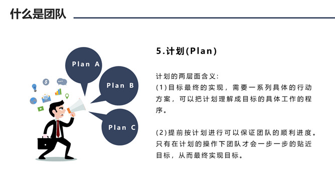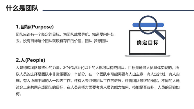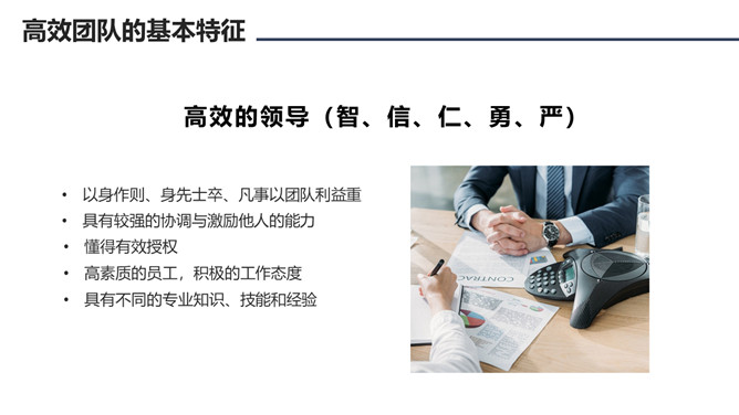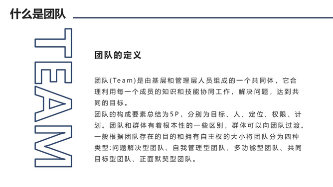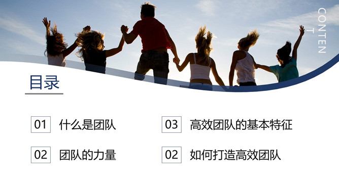 企业团队精神培训课件PPT模板。内容包括什么是团队、团队的力量、高效团队的基本特征、如何打造高效团队。