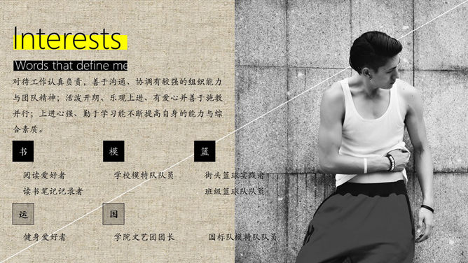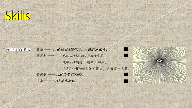 这是一份很有个性的个人简历PPT模板。宽屏设计版式,背景采用非常有质感的帆布布纹,与众不同的风格容易给观众留下深刻的印象。包括兴趣爱好、教育经历、社会经验等页面。使用字体: