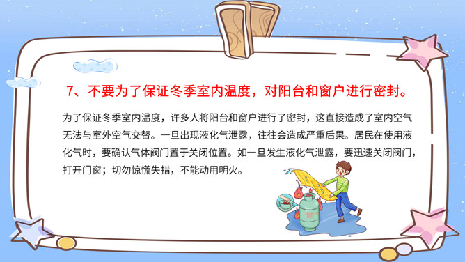冬季防火安全知识班会课件PPT模板。内容包括冬季防火特点、冬季防火七不要、冬季火灾逃生常识、常见危险情况及施救。