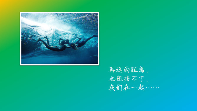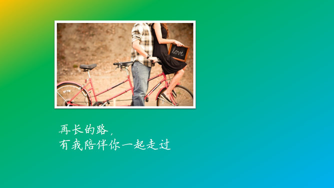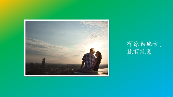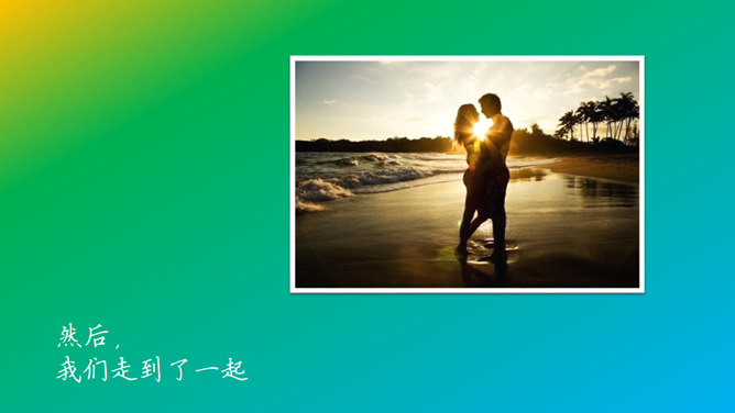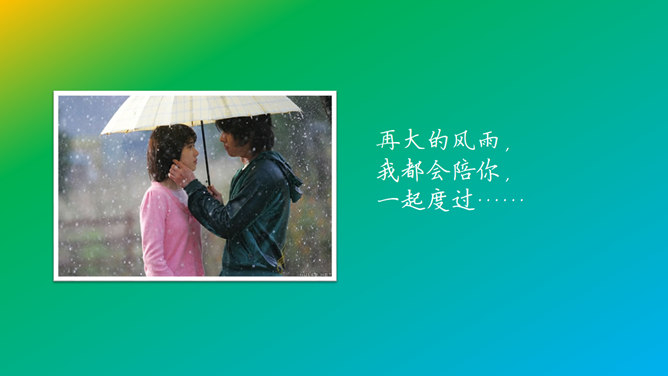 这是一份用来展示情侣之间幸福瞬间的照片的动态PPT模板。以渐变的彩虹色为底色,彩色色块组成的心形为背景,每个内页都有一张照片,配上优美的文字,翻书效果的动态切换。使用字体:方正硬笔楷书简体、钟齐段宁行书。