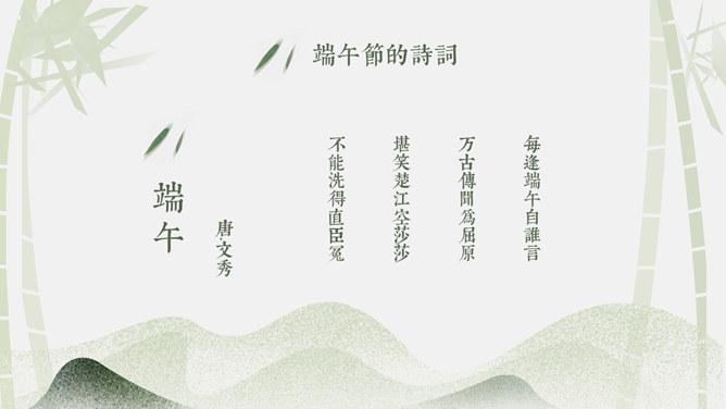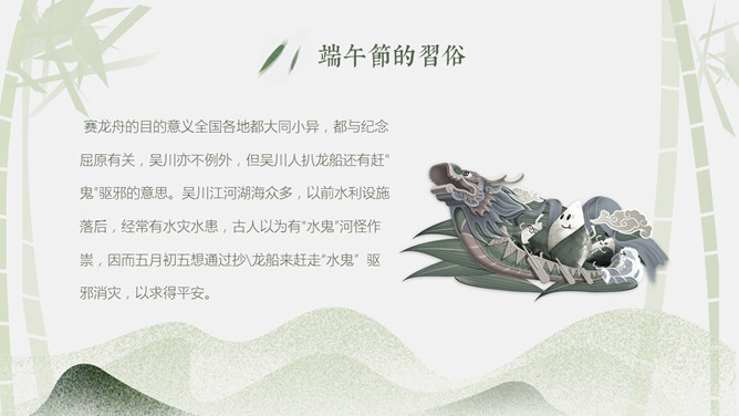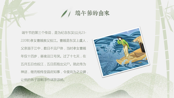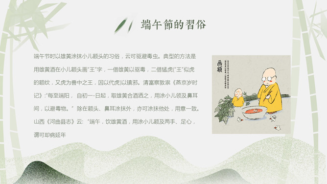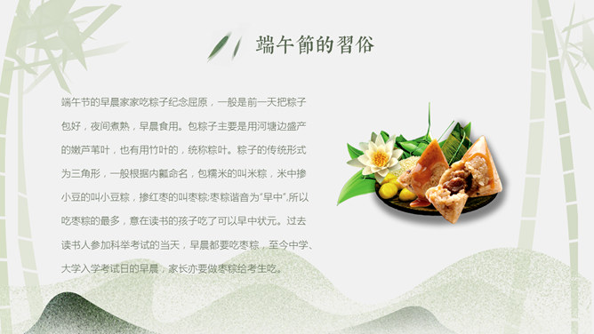 这是一份介绍中国传统节日端午节的幻灯片,共19页。图文并茂的排版,非常直观。内页详细介绍了端午节的历史起源、习俗文化、节日意义,并分析了中国传统文化传承的缺失。建议安装字体: