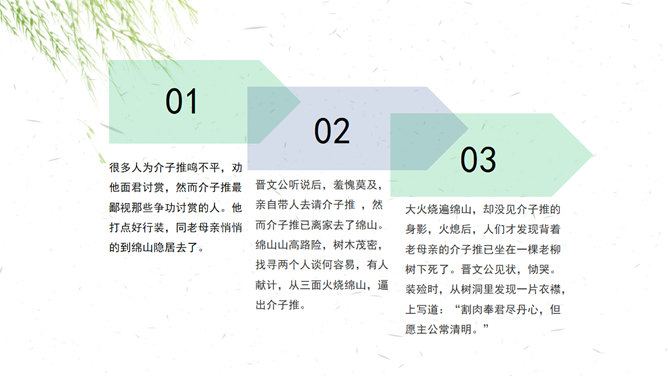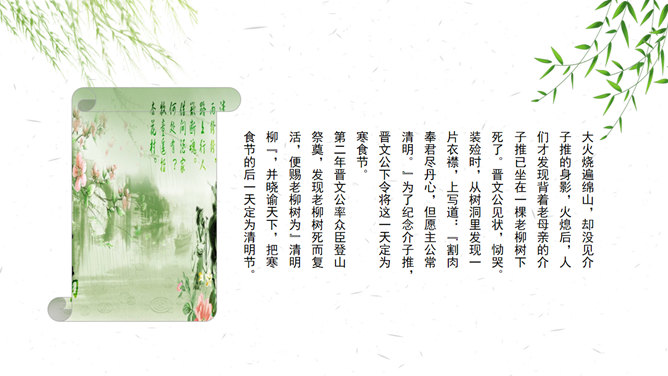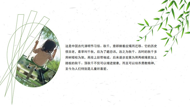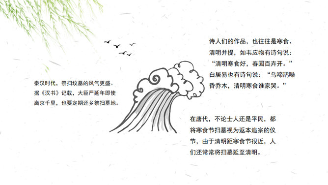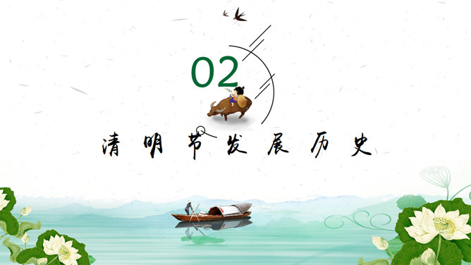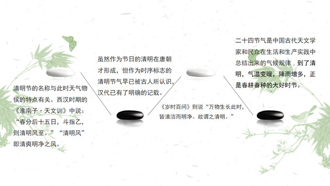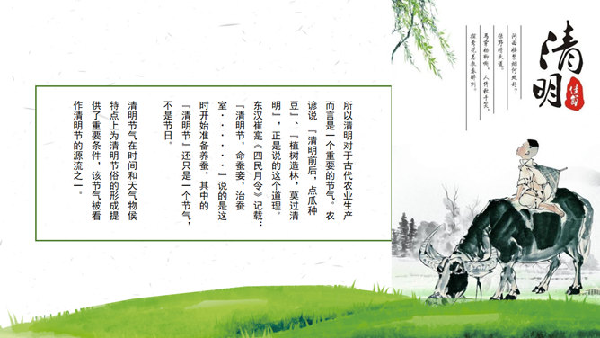 这是一份介绍清明节文化习俗的幻灯片。首页以动态的烟雨朦胧效果为背景,内页介绍了清明的历史来历、传统习俗等内容。可用于教育课件的制作。