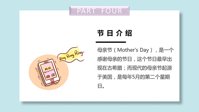 感恩母亲节PPT模板下载。一套母亲节主题幻灯片模板,可用于母亲节节的介绍或母亲节主题活动使用。