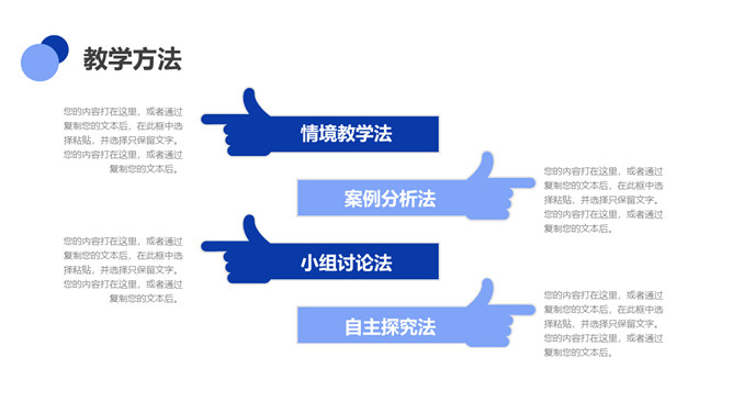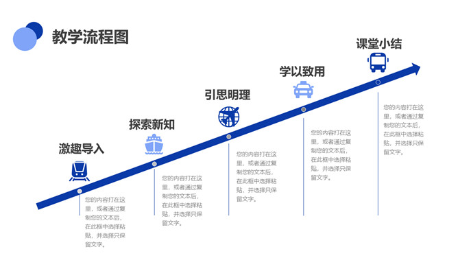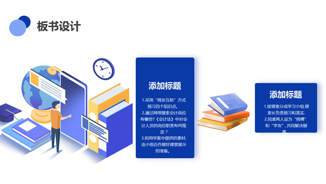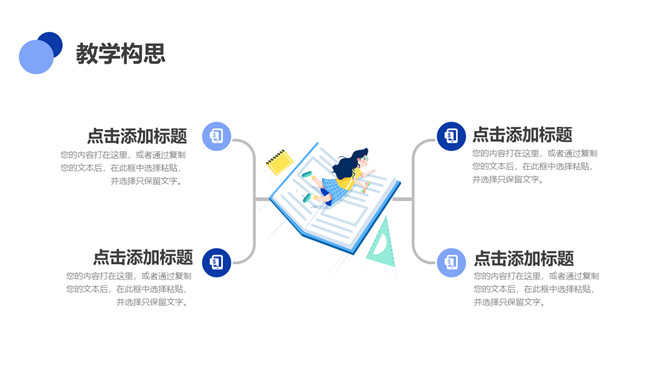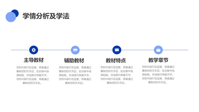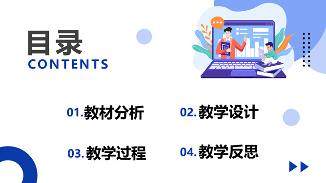 信息化教学设计说课PPT模板。一套信息化教学设计幻灯片模板,矢量扁平化设计,包括教材分析、教学设计、教学过程、教学反思等内容。
