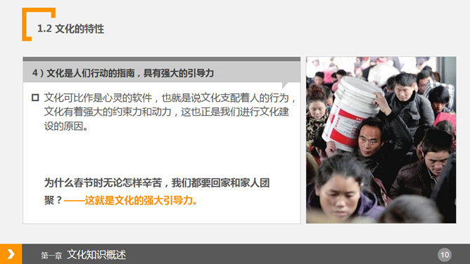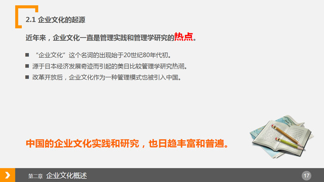 这是一份非常专业的企业文化建设相关的PPT,共45页,从文化知识概述;企业文化概述;为啥要做文化,需要何种文化四个方面进行探讨。设计非常精美,简约大气,华丽的动态效果。既有漂亮的外表,又有丰富的内涵。可用于企业文化建设培训使用。