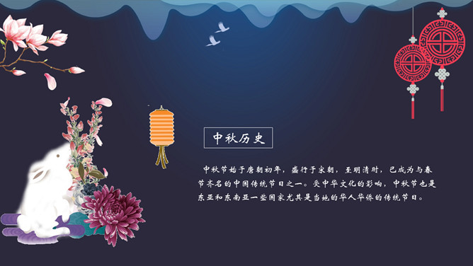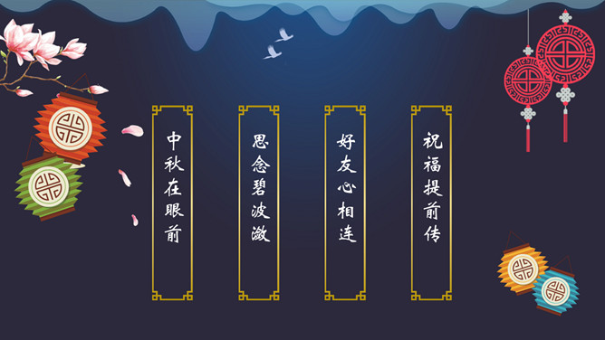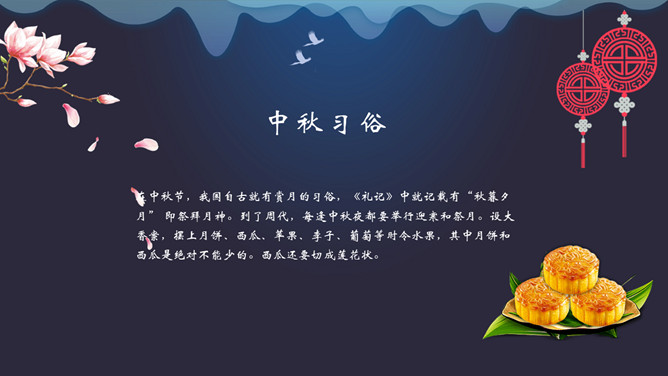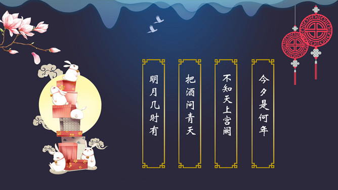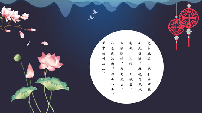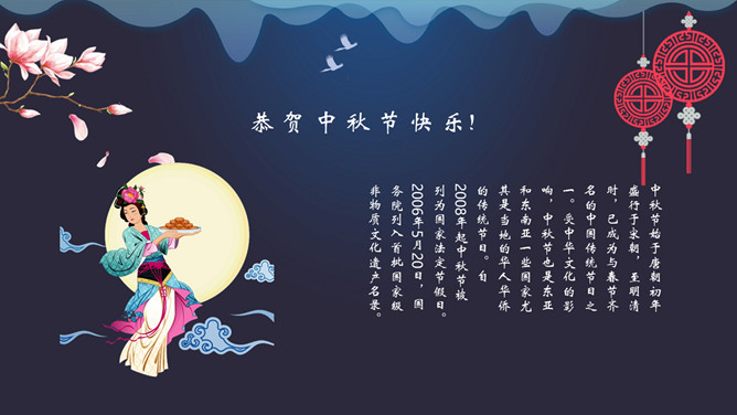 。带有牡丹花纹的红色背景上,一副国画风格的卷轴缓缓打开,用月亮、月饼装饰,给人喜庆华贵的感觉。