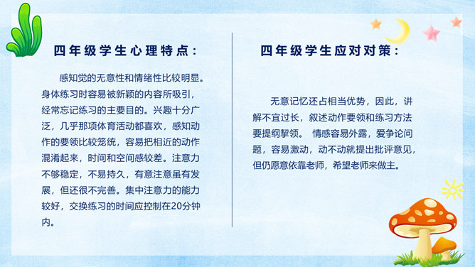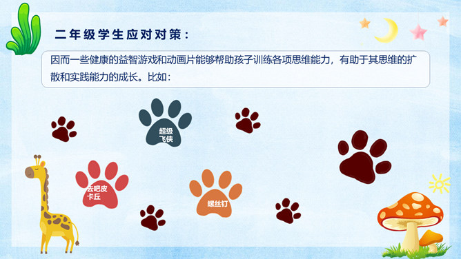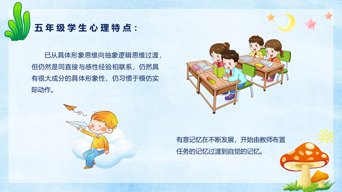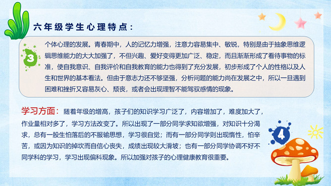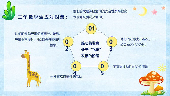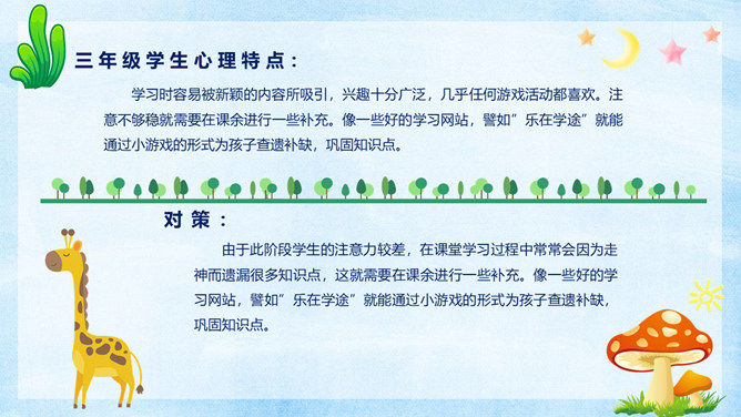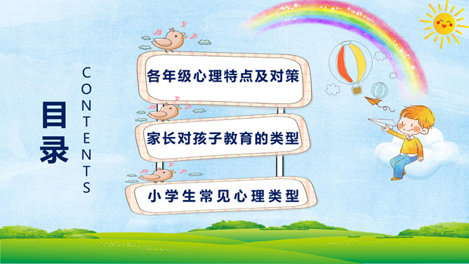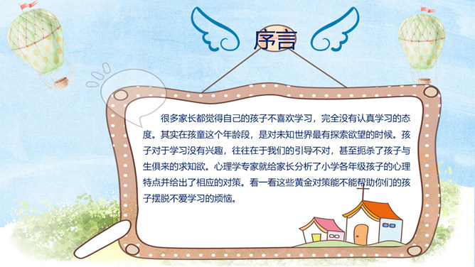 小学生心理健康教育PPT模板。很多家长都觉得自己的孩子不喜欢学习,完全没有认真学习的态度。其实在孩童这个年龄段,是对未知世界最有探索欲望的时候。孩子对于学习没有兴趣,往往在于我们的引导不对,甚至扼杀了孩子与生俱来的求知欲。