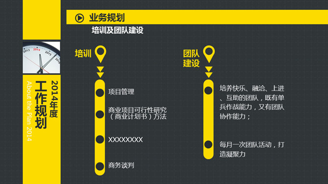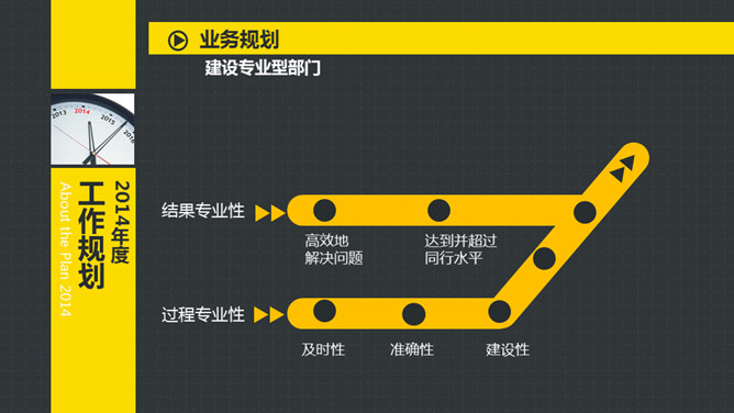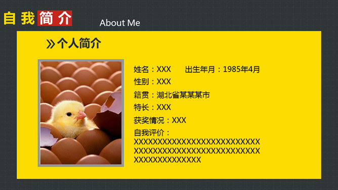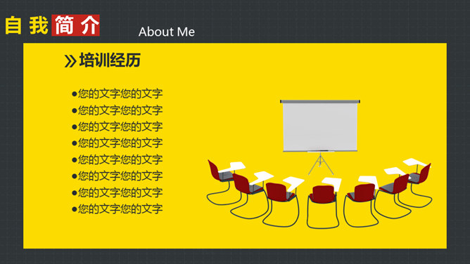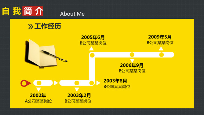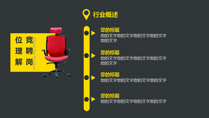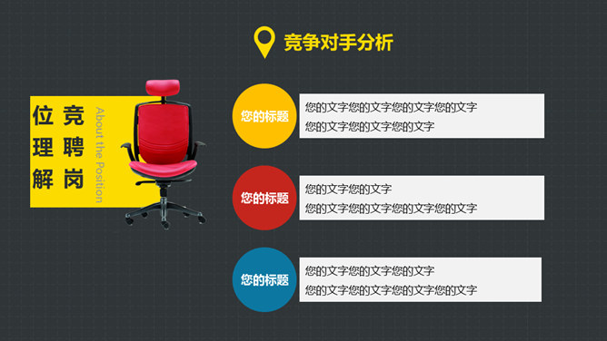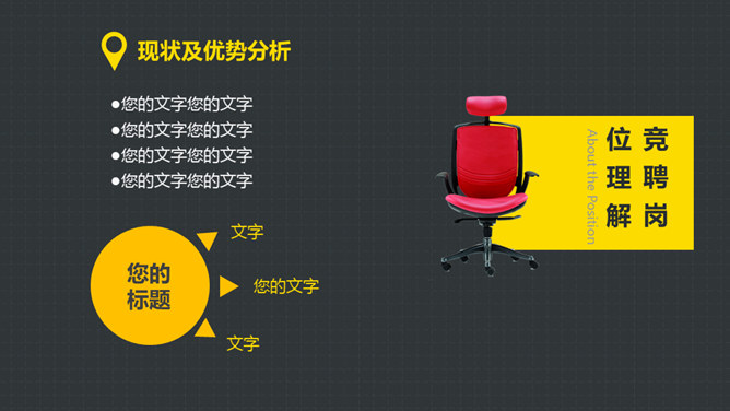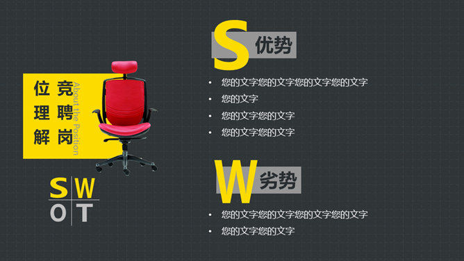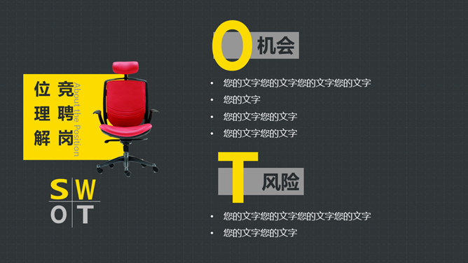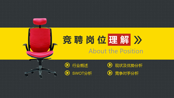 岗位竞聘述职报告PPT模板。以鲜艳明快的黄色为主题色,给人以积极活力之感,共有25个页面,包括了自我介绍、SWOT分析、工作规划等内容。此模板设计精美,功能丰富,适用于竞聘报告、求职简历、个人竞争分析等相关用途。