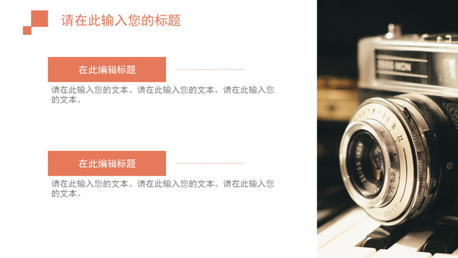 文艺范LOMO摄影PPT模板。一套小清新文艺范LOMO风格幻灯片模板,以拿照相机的女孩为背景,适合摄影相关主题。