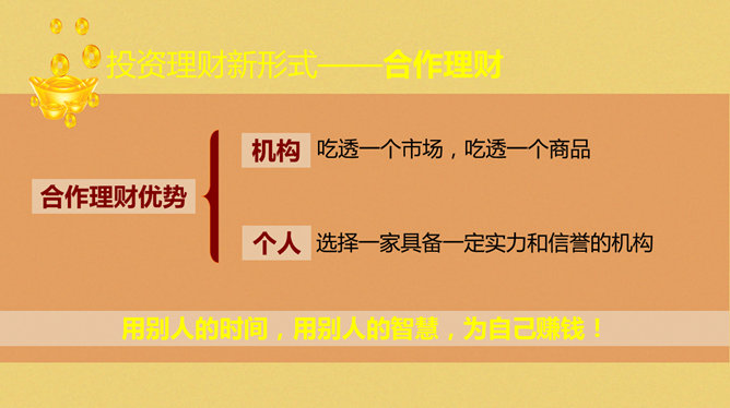 投资理财交流沙龙会PPT模板。一套投资理财主题幻灯片模板,内容和素材非常丰富,更换文本即可适用其他主题。