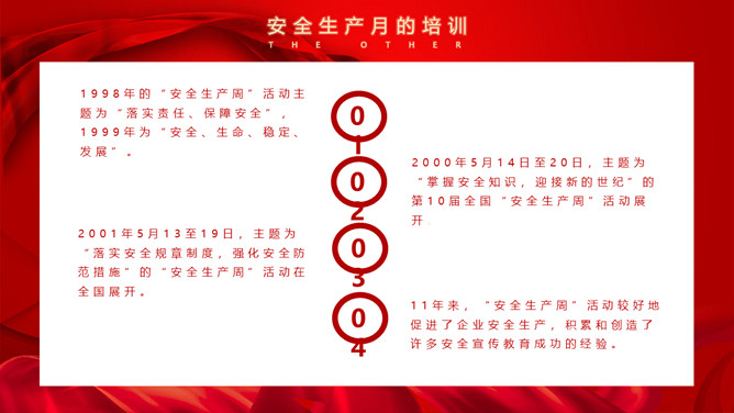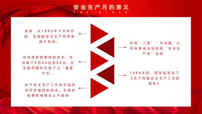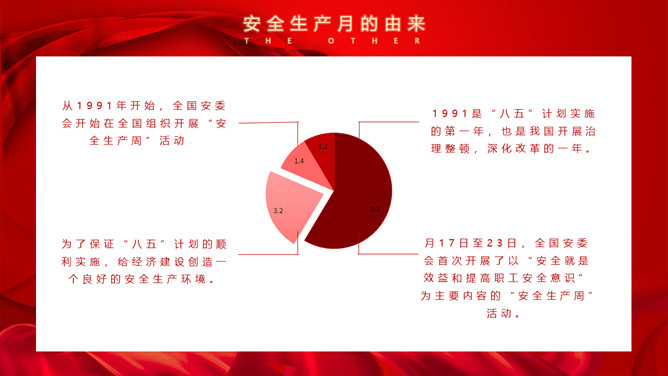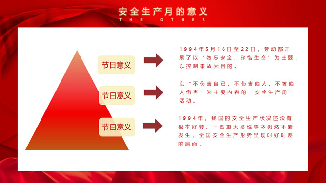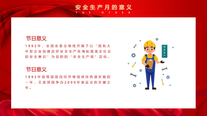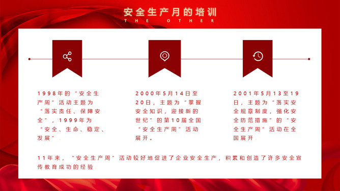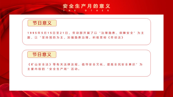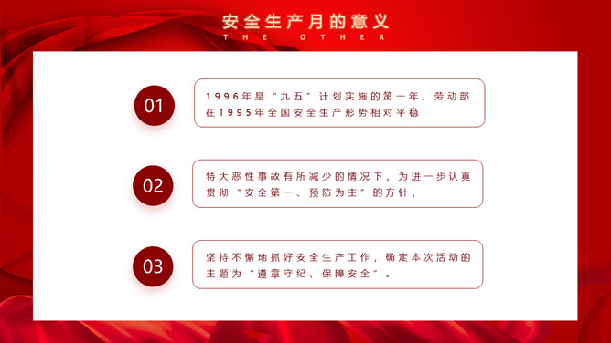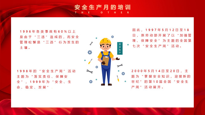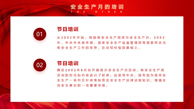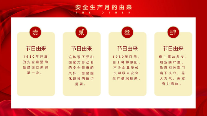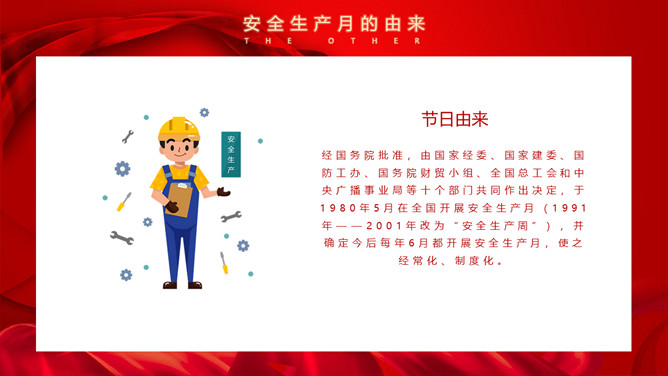 安全生产月安全管理培训PPT模板。1980年开展的安全月活动是建国以来的第一次。这体现了党和国家对劳动者的安全健康的关怀,也是四化建设的迫切需要。包括安全生产月的由来、意义、培训和感受等内容。