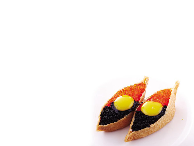 美味日本寿司PPT背景图片。以三文鱼、鱼子酱、鲜虾等各式日式寿司为背景,黑色镜面效果为底色,让人看了垂涎欲滴,适合用于介绍寿司的食材、种类、做法等相关的内容。