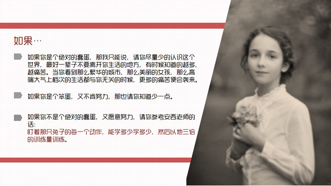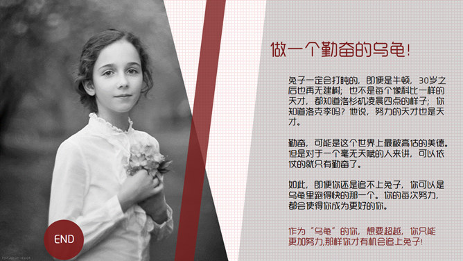 如果兔子拼命奔跑励志PPT作品。一套设计精美的励志故事PPT作品,包括我自己的那些事、兔子与乌龟竞争的故事、我们能做什么三部分。建议安装字体: