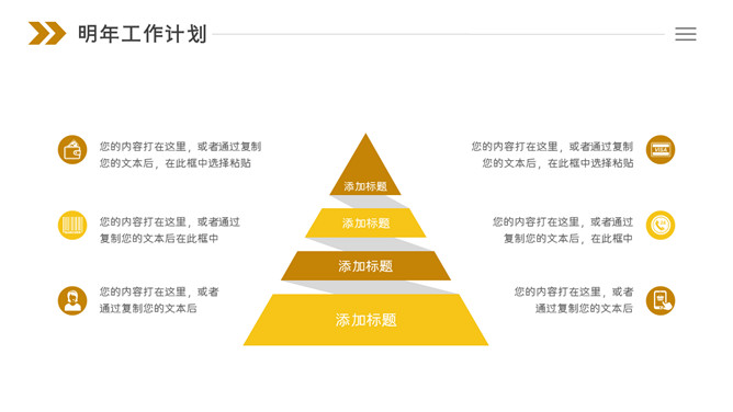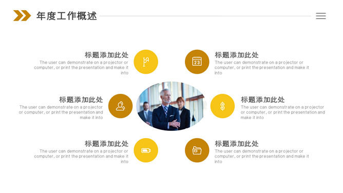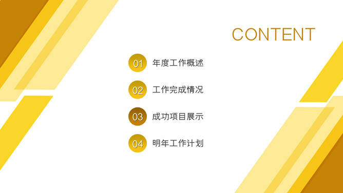 部门年度总结汇报PPT模板。一份公司部门年终工作总结汇报幻灯片模板,黄棕色斜条纹装饰,简约设计。