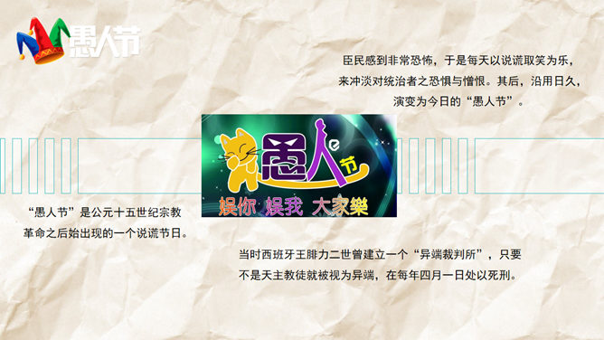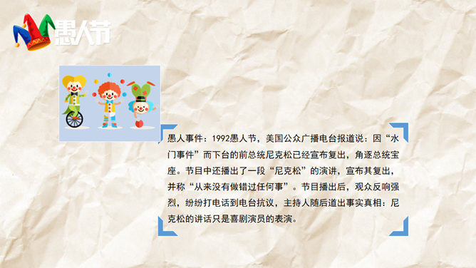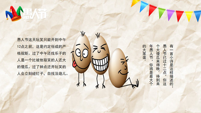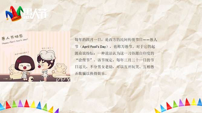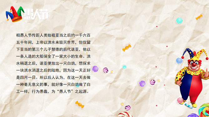 一份愚人节主题的PPT模板。愚人节节期为公历4月1日,是从19世纪开始在西方兴起流行的民间节日,并未被任何国家认定为法定节日。在这一天人们以各种方式互相捉弄,往往在玩笑的最后才揭穿并宣告捉弄对象为“愚人”。