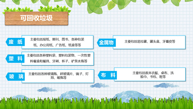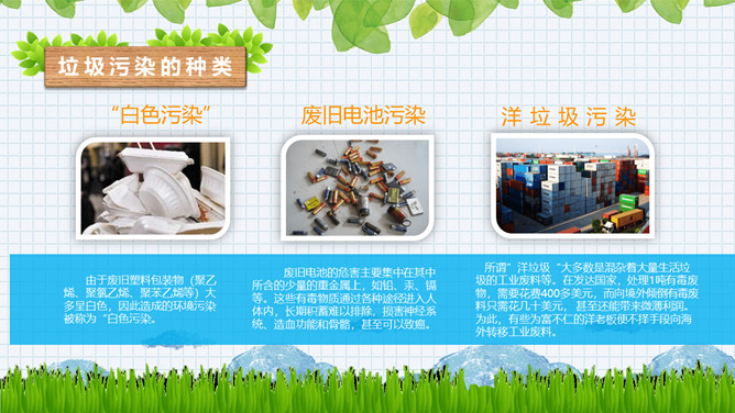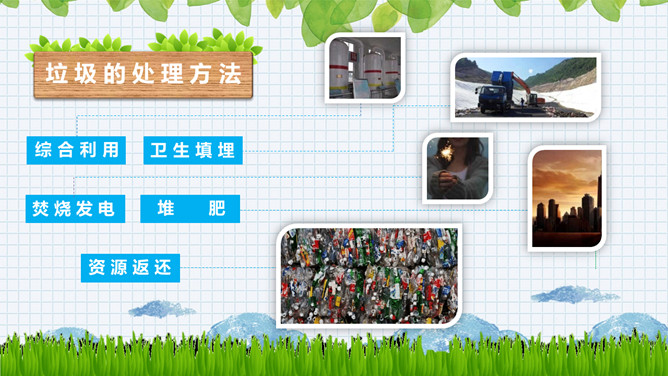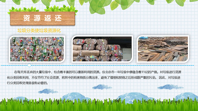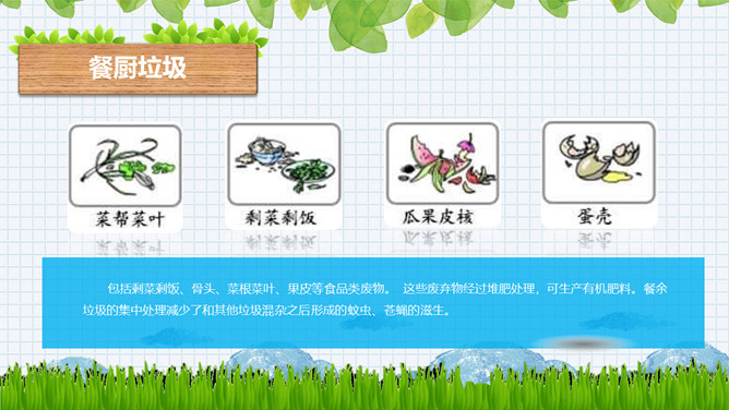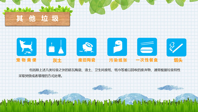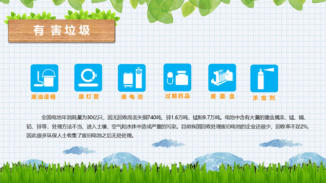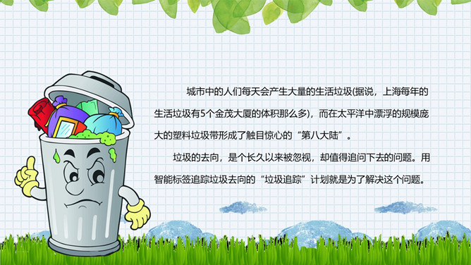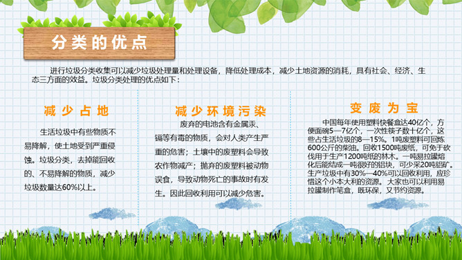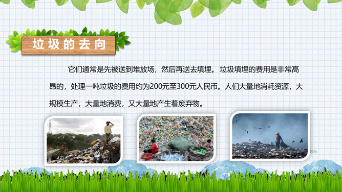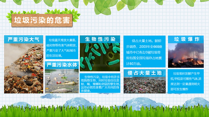 小学生垃圾分类主题班会PPT模板。一套小学生垃圾分类环保宣传教育模板,包括垃圾处理的现状、垃圾的分类和如何做好垃圾分类。