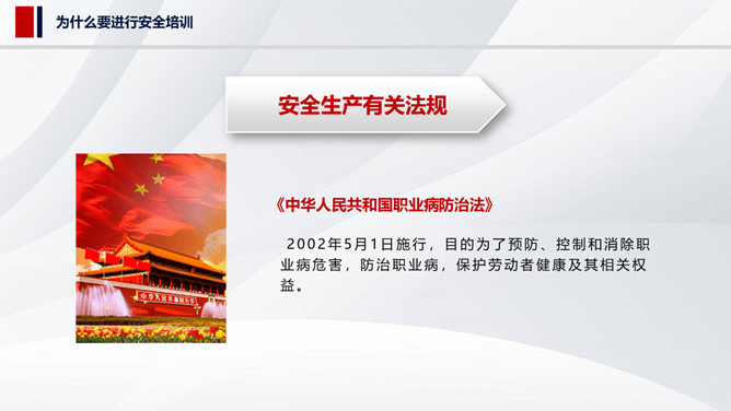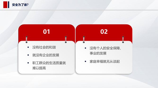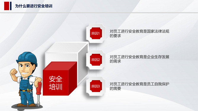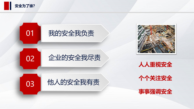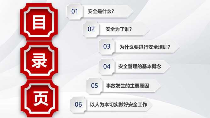 安全生产培训PPT课件模板。目录:安全是什么?安全为了谁?为什么要进行安全培训?安全管理的基本概念。事故发生的主要原因。以人为本切实做好安全工作。