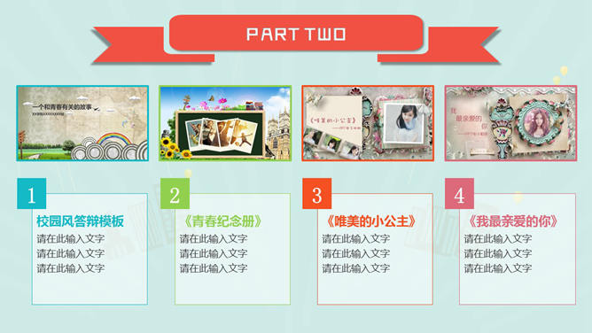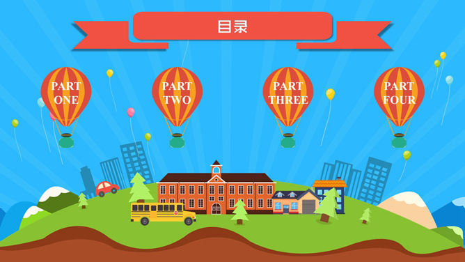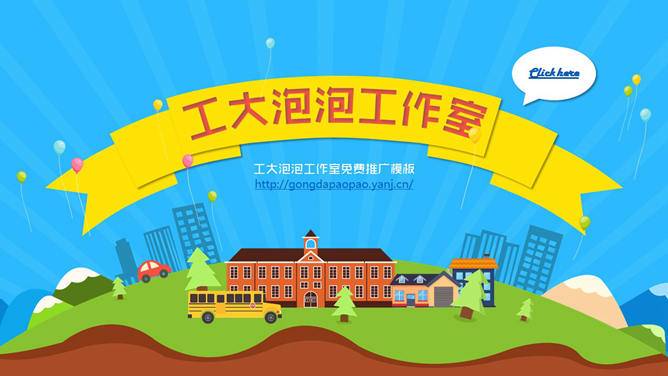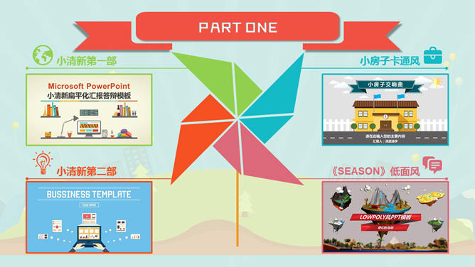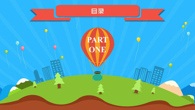 一份精美的卡通风格PPT模板,时尚的扁平化设计,色彩配色艳丽,可用于小学或幼儿园课件制作、儿童绘画展示等。建议安装字体: