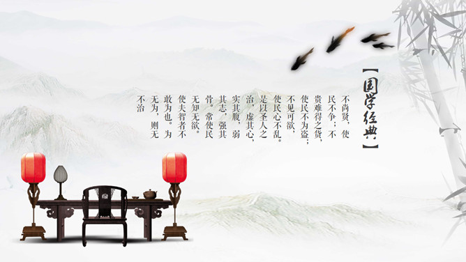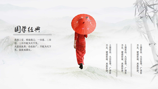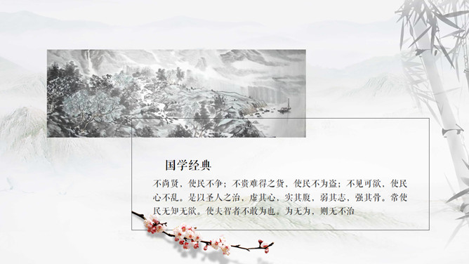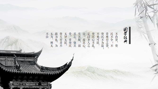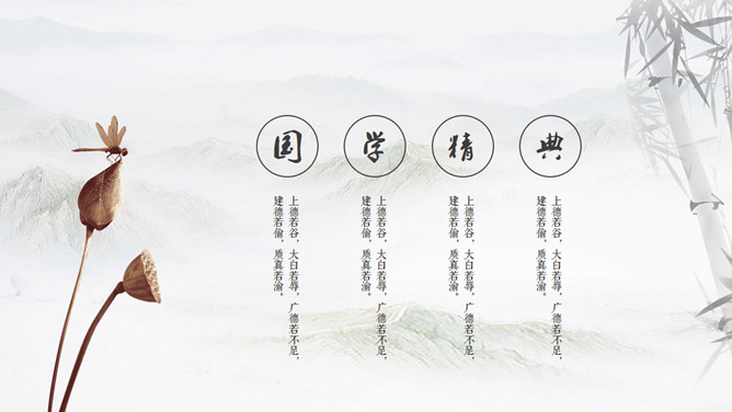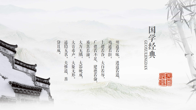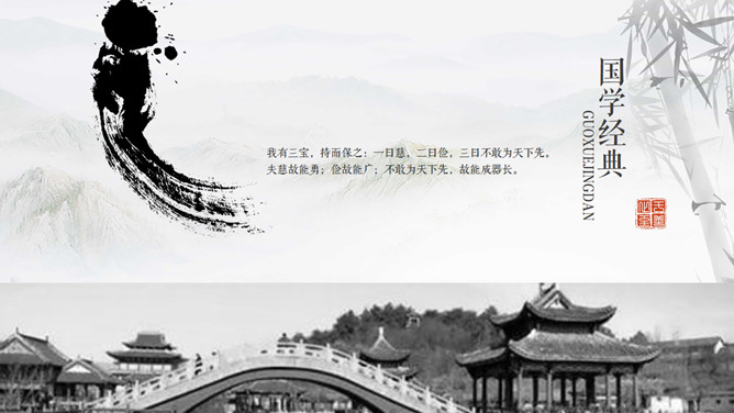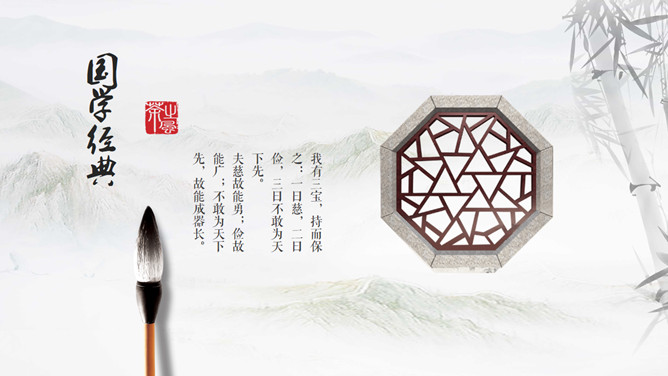 国学文化古典中国风PPT模板。一套古典中国风幻灯片模板,以传统文化元素设计,适合国学文化相关主题。建议安装字体: