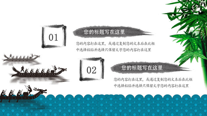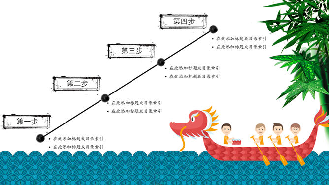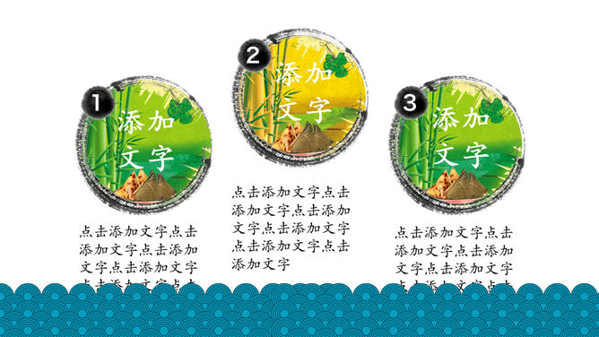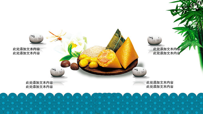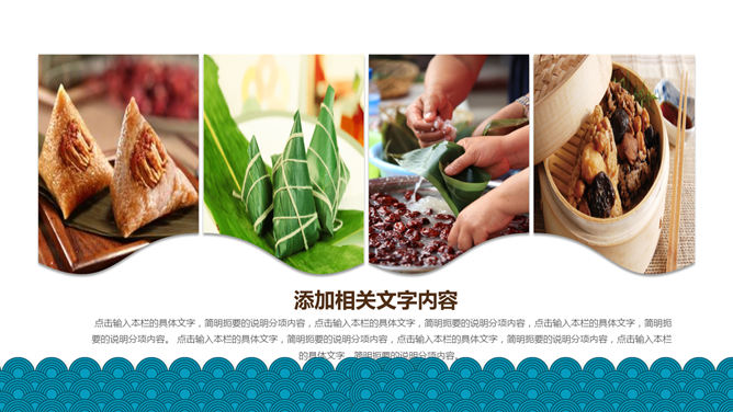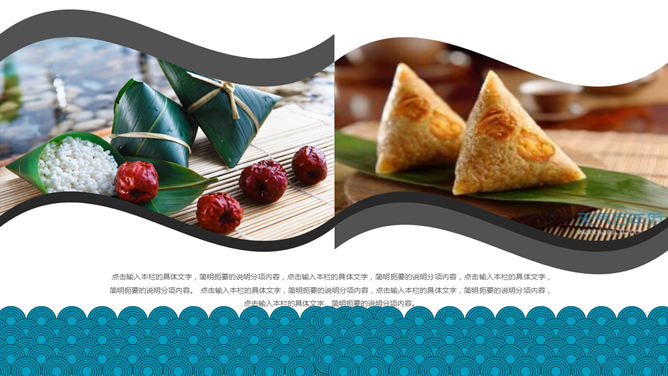 这是一份端午节主题的幻灯片模板,绿色主色调,美味的粽子背景,动态播放,传统中国风格。关键词: