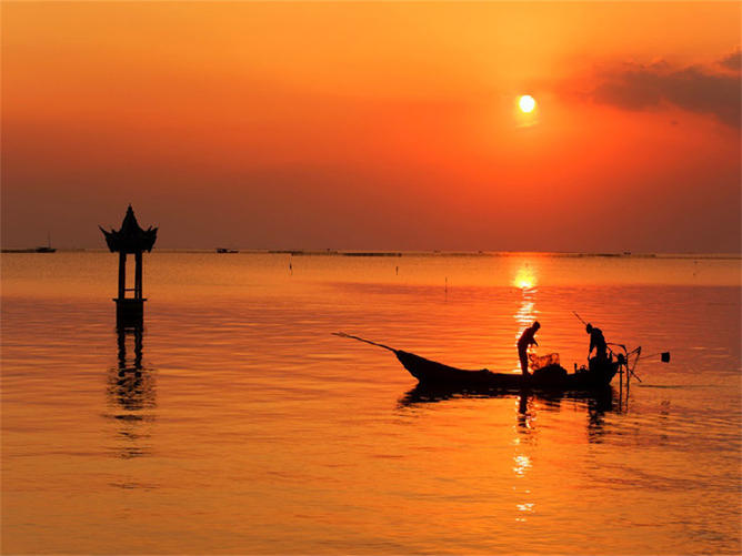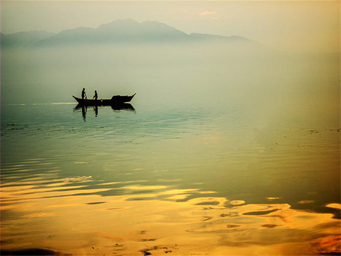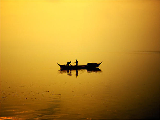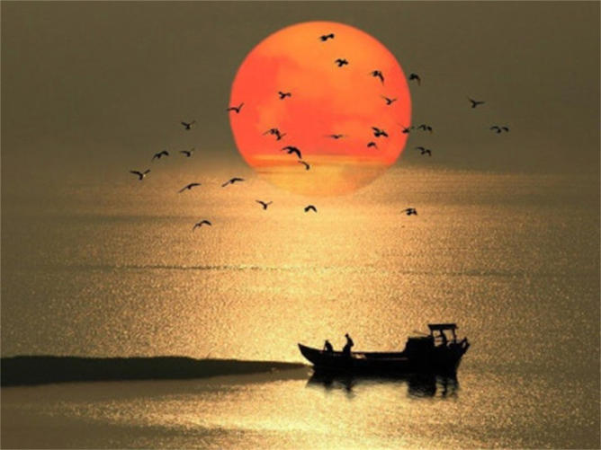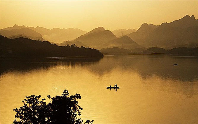 渔舟唱晚幻灯片背景图片,夕阳下,江面上的小渔船,远处群山起伏,鸟儿归巢,关键词: