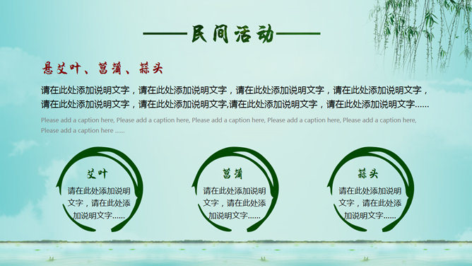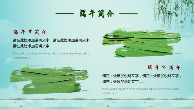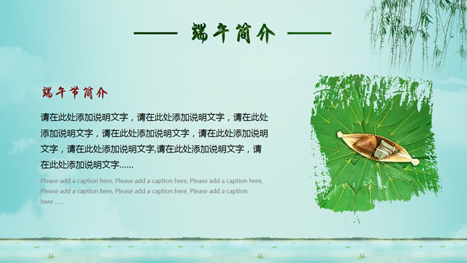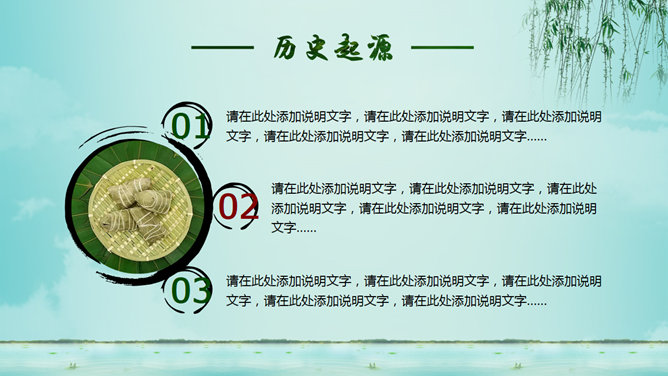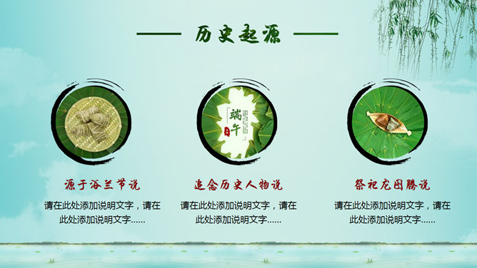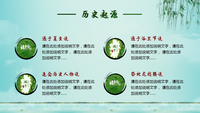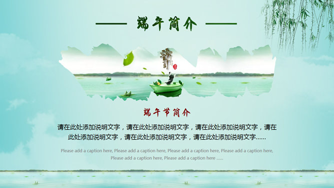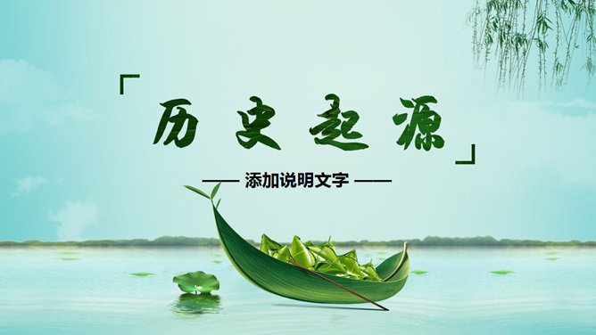 这是一份端午节主题的幻灯片,共32页,内容丰富。目录:端午节的来历、端午节的主要习俗、端午节诗词和当代演化。建议安装字体: